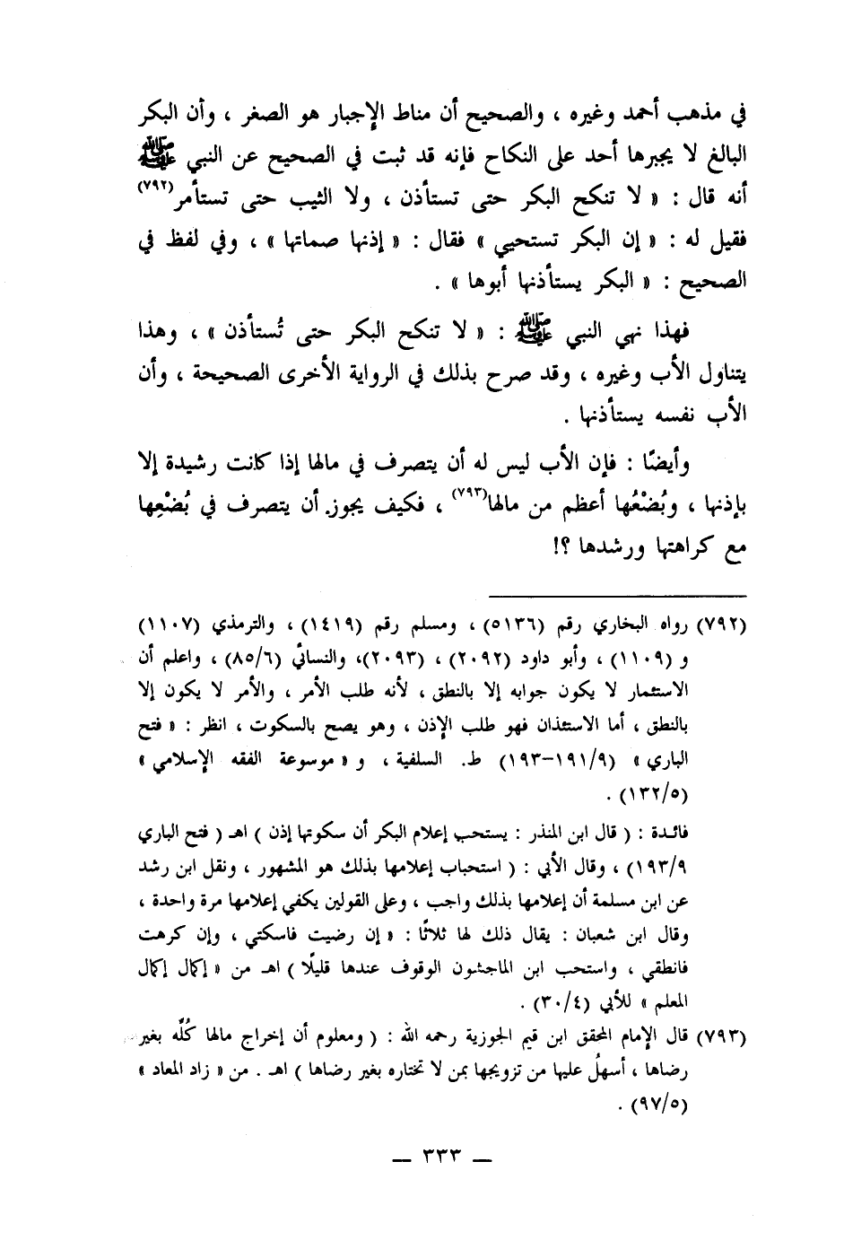 في مذهب أحمد وغيره، والصحيح أن مناط الإجبار هو الصغر، وأن البكر البالغ لا يجبرها أحد على النكاح فإنه قد ثبت في الصحيح عن النبي صلى الله عليه وسلم أنه قال: " لا تنكح البكر حتى تستأذن، ولا الثيب حتى تستأمر (792) فقيل له: "إن البكر تستحيي" فقال: " إذنها صماتها"، وفي لفظ في الصحيح: " البكر يستأذنها أبوها".