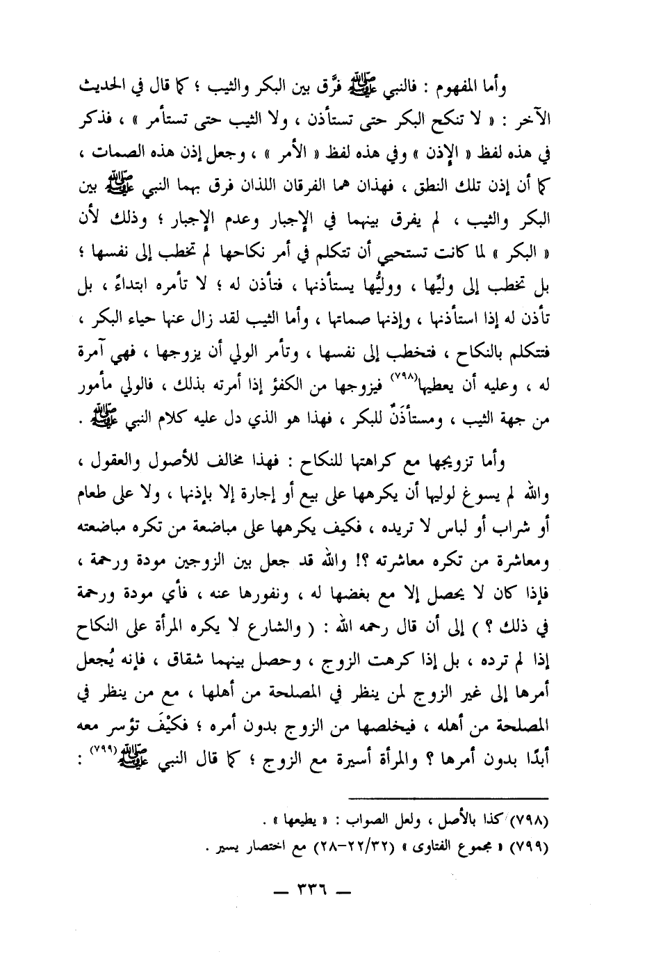 وأما المفهوم: فالنبي صلى الله عليه وسلم فرَّق بين البكر والثيب؛ كما قال في الحديث الآخر: " لا تنكح البكر حتى تستأذن، ولا الثيب حتى تستأمر "، فذكر في هذه لفظ " الإذن" وفي هذه لفظ " الأمر"، وجعل إذن هذه الصمات، كما أن إذن تلك النطق، فهذان هما الفرقان اللذان فرق بهما النبي صلى الله عليه وسلم بين البكر والثيب، لم يفرق بينهما في الإجبار وعدم الإجبار؛ وذلك لأن "البكر" لما كانت تستحيي أن تتكلم في أمر نكاحها لم تخطب إلى نفسها؛ بل تخطب إلى وليّها، ووليُّها يستأذنها، فتأذن له؛ لا تأمره ابتداءً، بل تأذن له إذا استأذنها، وإذنها صماتها، وأما الثيب لقد زال عنها حياء البكر، فتتكلم بالنكاح، فتخطب إلى نفسها، وتأمر الولي أن يزوجها، فهي آمرة له، وعليه أن يعطيها (798) فيزوجها من الكفؤ إذا أمرته بذلك، فالولي مأمور من جهة الثيب، ومستأذَن للبكر، فهذا هو الذي دل عليه كلام النبي صلى الله عليه وسلم. وأما تزويجها مع كراهتها للنكاح: فهذا مخالف للأصول والعقول، والله لم يسوغ لوليها أن يكرهها على بيع أو إجارة إلا بإذنها، ولا على طعام أو شراب أو لباس لا تريده، فكيف يكرهها على مباضعة من تكره مباضعته ومعاشرة من تكره معاشرته؟! والله قد جعل بين الزوجين مودة ورحمة، فإذا كان لا يحصل إلا مع بغضها له، ونفورها عنه، فأي مودة ورحمة في ذلك؟) إلى أن قال رحمه الله: (والشارع لا يكره المرأة على النكاح إذا لم ترده، بل إذا كرهت الزوج، وحصل بينهما شقاق، فإنه يُجعل أمرها إلى غير الزوج لمن ينظر في المصلحة من أهلها، مع من ينظر في المصلحة من أهله، فيخلصها من الزوج بدون أمره؛ فكيْفَ تؤسر معه أبدًا بدون أمرها؟ والمرأة أسيرة مع الزوج؛ كما قال النبي صلى الله عليه وسلم (799) :