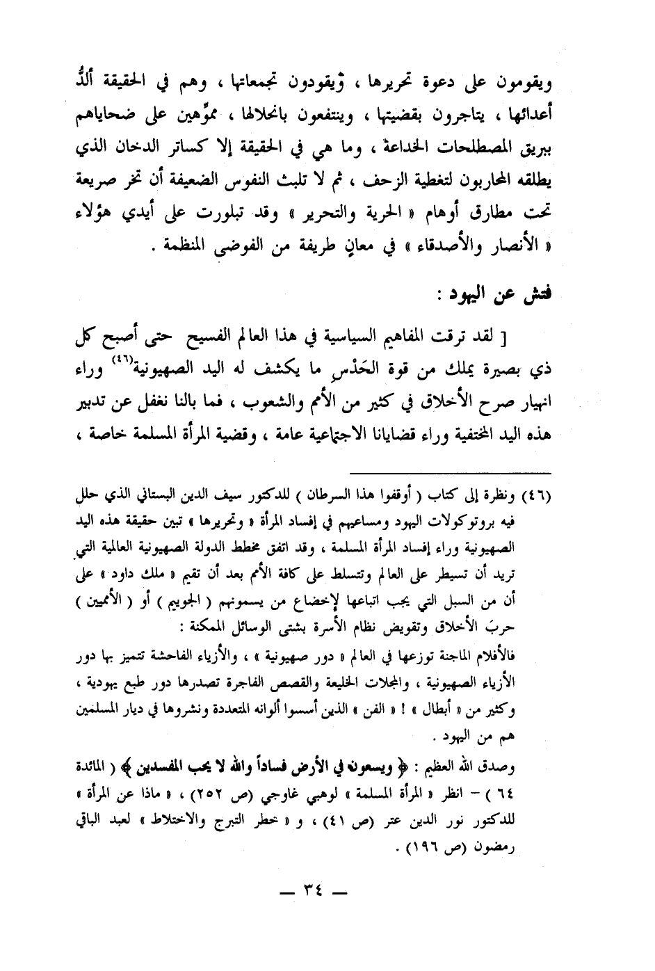 [لقد ترقت المفاهيم السياسية في هذا العالم الفسيح حتى أصبح كل ذى بصيرة يملك من قوة الحَدس ما يكشف له اليد الصهيونية (46) وراء انهيار صرح الأخلاق في كثير من الأمم والشعوب، فما بالنا نغفل عن تدبير هذه اليد المختفية وراء قضايانا الاجتماعية عامة، وقضية المرأة المسلمة خاصة،