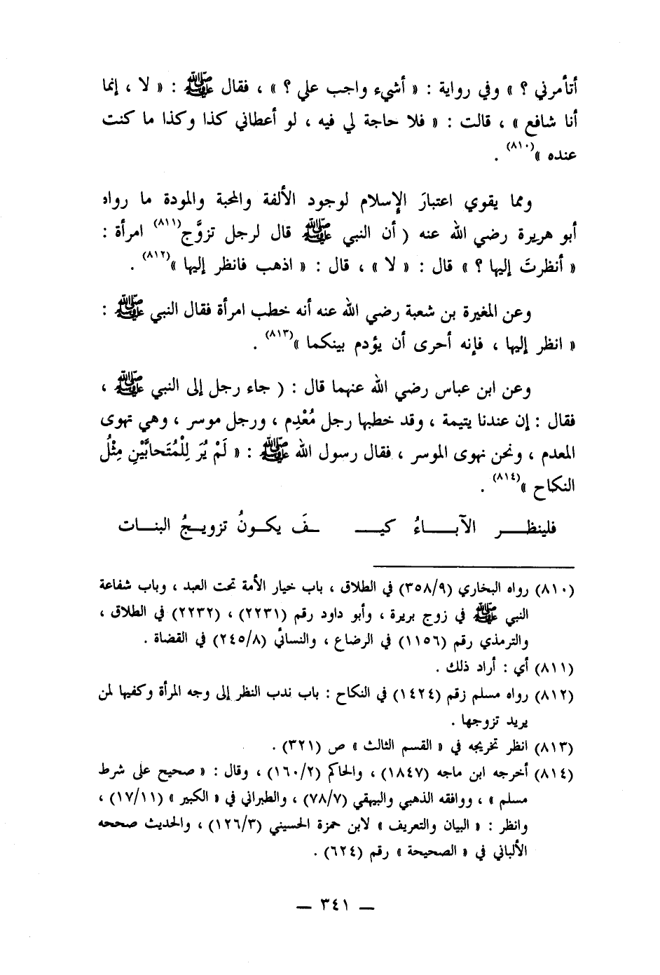 ومما يقوى اعتبارَ الإسلام لوجود الألفة والمحبة والمودة ما رواه أبو هريرة رضي الله عنه (أن النبي صلى الله عليه وسلم قال لرجل تزوَّج (811) امرأة: " أنظرتَ إليها؟ " قال: "لا"، قال: " اذهب فانظر إليها" (812) .