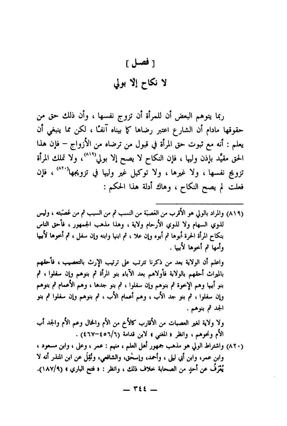 (820) واشتراط الولي هو مذهب جمهور أهل العلم، منهم: عمر، وعلى، وابن مسعود، وابن عمر، وابن أبي ليلى، وأحمد، وإسحق، والشافعي، ونقِلَ عن ابن المنذر أنه لا يعرفُ عن أحد من الصحابة خلاف ذلك، وانظر: " فتح الباري" (9/187) .