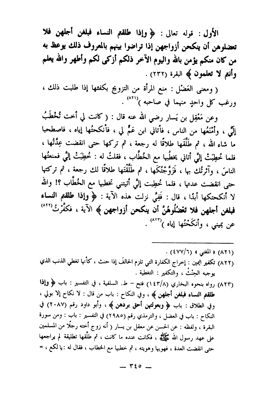 (823) رواه بنحوه البخاري (8/143) فتح - ط. السلفية، في التفسير: باب (وإذا طلقتم النساء فبلغن أجلهن) ، وفي النكاح: باب من قال: لا نكاح إلا بولي، وفي الطلاق: باب (وبعولتهن أحق بردهن) ، وأبو داود رقم (2087) في النكاح: باب في العضل، والترمذي رقم (2985) في التفسير: باب: ومن سورة البقرة، ولفظه: عن الحسن عن معقل بن يسار (أنه زوج أخته رجلا من المسلمين على عهد رسول الله صلى الله عليه وسلم، فكانت عنده ما كانت، ثم طلَّقها تطليقة لم يراجعها حتى انقضت العدة، فهويها وهويته، ثم خطبها مع الخطاب، فقال له: يا لكع، =