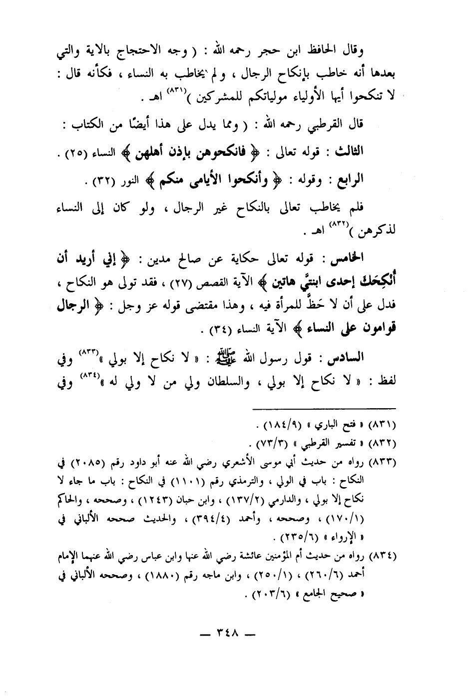 السادس: قول رسول الله صلى الله عليه وسلم: " لا نكاح إلا بولي" (833) وفي لفظ: " لا نكاح إلا بولي، والسلطان ولي من لا ولي له" (834) وفي