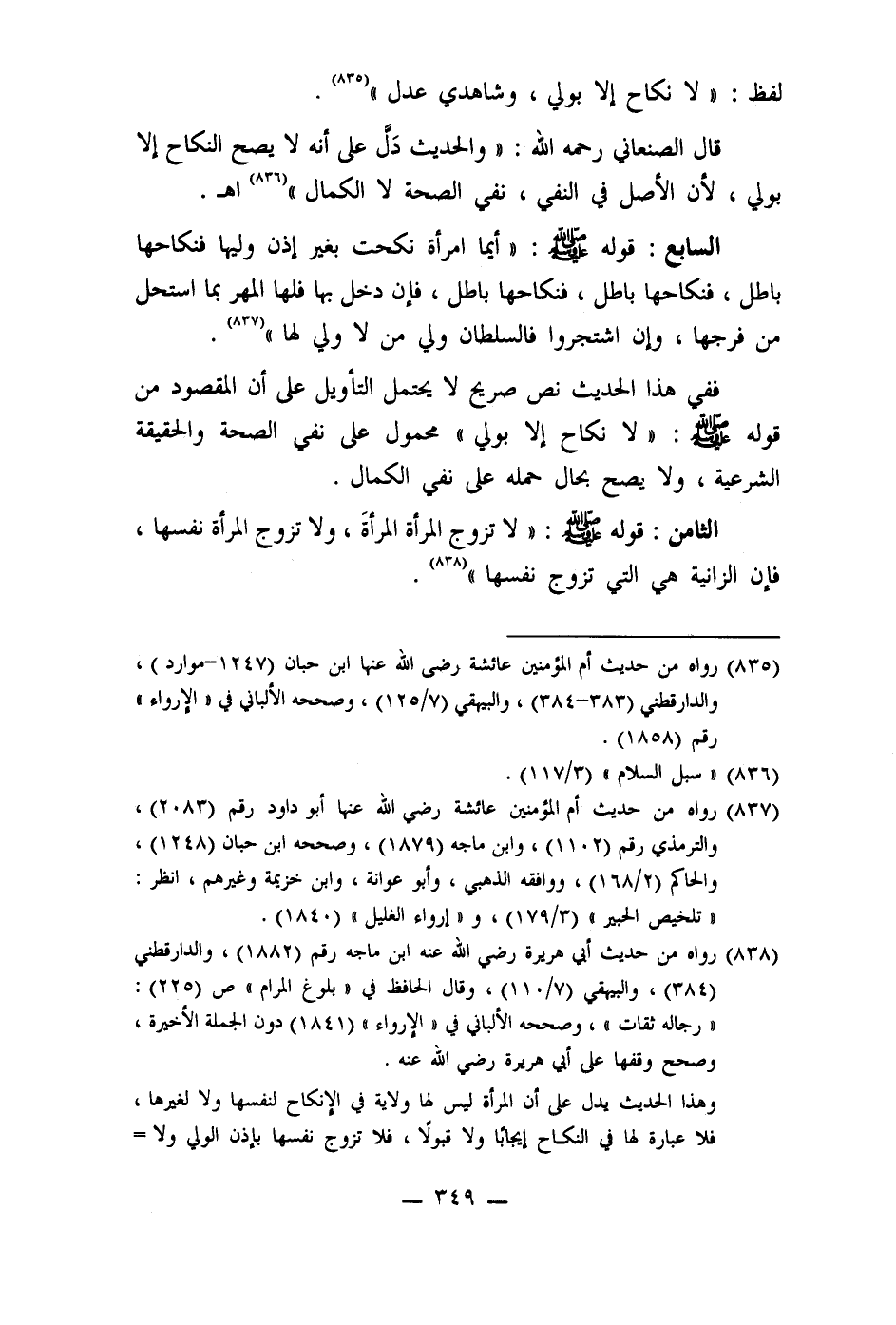 قال الصنعاني رحمه الله: " والحديث دَل على أنه لا يصح النكاح إلا بولي، لأن الأصل في النفي، نفي الصحة لا الكمال" (836) اهـ.