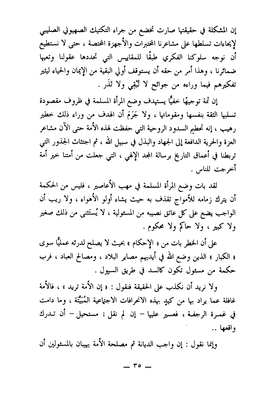 إن ثمة توجيهًا خفيا يستهدف وضع المرأة المسلمة في ظروف مقصودة تسلبها الثقة بنفسها ومقوماتها، ولا جَرَمَ أن الهدف من وراء ذلك خطير رهيب، إنه تحطيم السدود الروحية التي حفظت لهذه الأمة حتى الآن مشاعر العزة والحرية الدافعة إلى الجهاد والبذل في سبيل الله، ثم اجتثاث الجذور التي تربطنا في أعماق التاريخ برسالة المجد الإلهي، التي جعلت من أمتنا خير أمة أخرجت للناس.