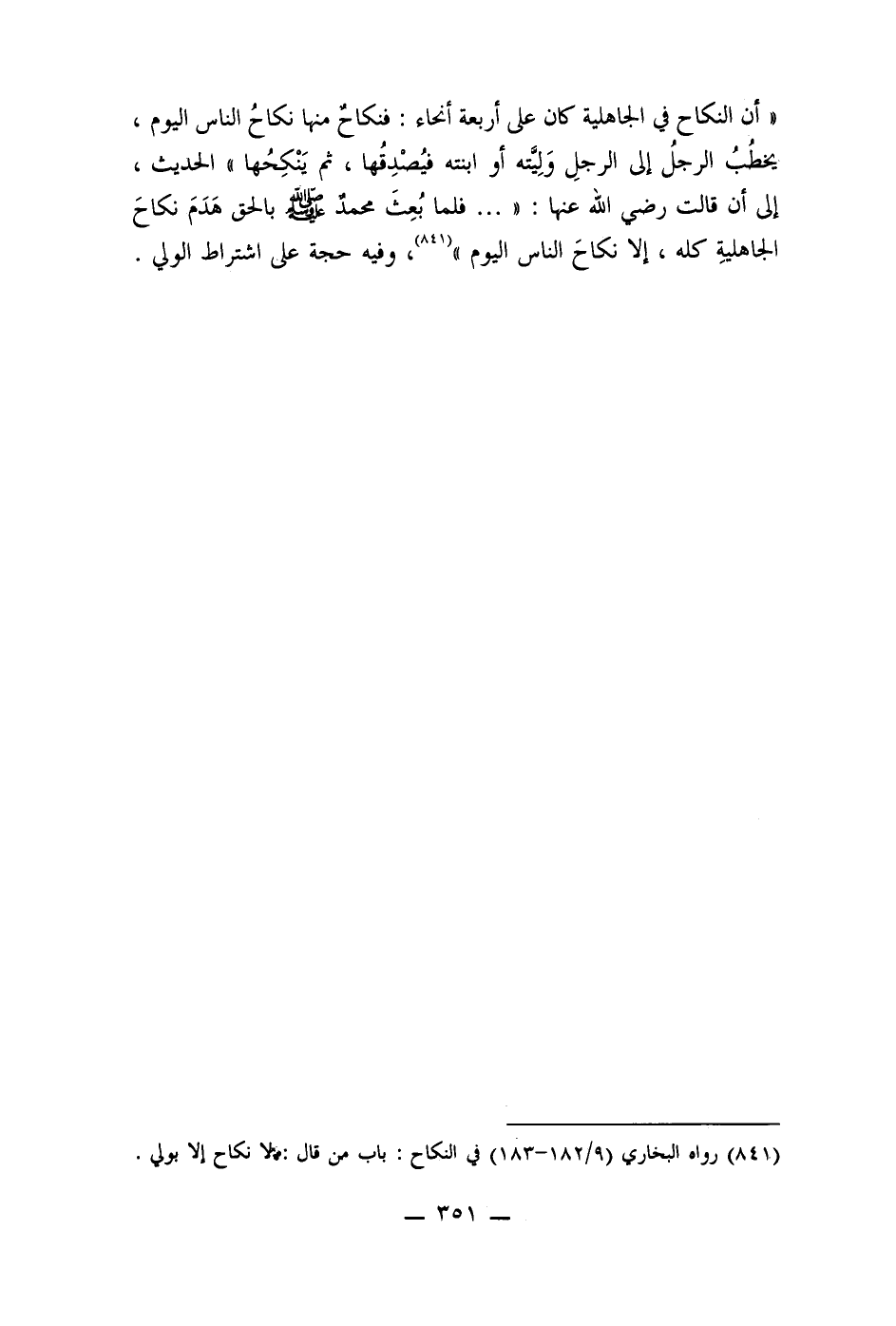 " أن النكاح في الجاهلية كان على أربعة أنحاء: فنكاح منها نكاحُ الناس اليوم، يخطُبُ الرجل إلى الرجلِ وَليته أو ابنته فيُصْدِقُها، ثم يَنْكِحُها " الحديث، إلى أن قالت رضي الله عنها: " ... فلما بُعِثَ محمد صلى الله عليه وسلم بالحق هَدَمَ نكاحَ الجاهلية كله، إلا نكاحَ الناس اليوم " (841) ، وفيه حجة على اشتراط الولي.