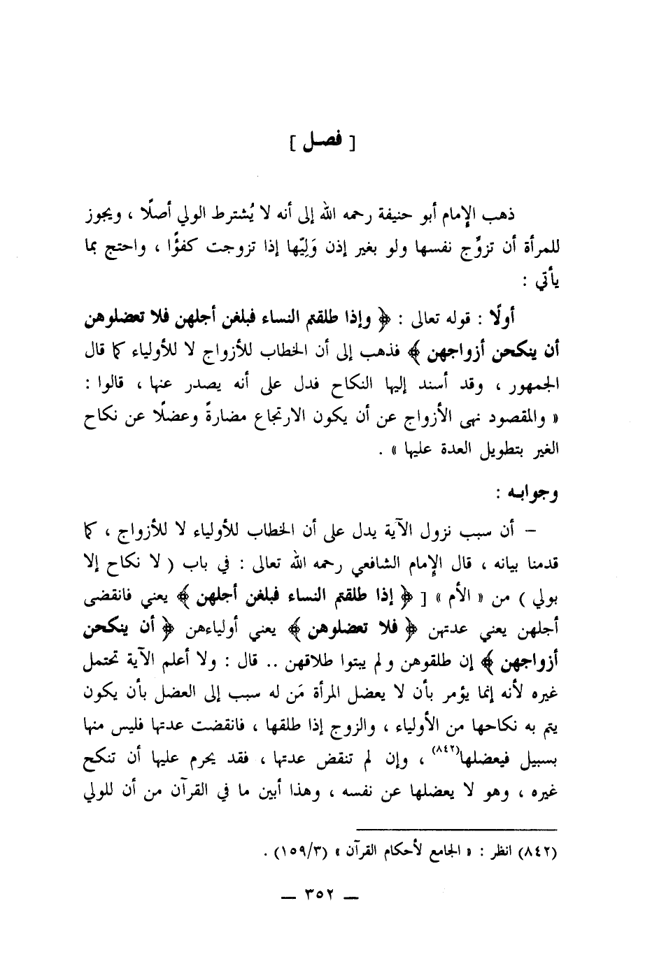 أولًا: قوله تعالى: (وإذا طلقتم النساء فبلغن أجلهن فلا تعضلوهن أن ينكحن أزواجهن) فذهب إلى اًن الخطاب للأزواج لا للأولياء كما قال الجمهور، وقد أسند إليها النكاح فدل على أنه يصدر عنها، قالوا: