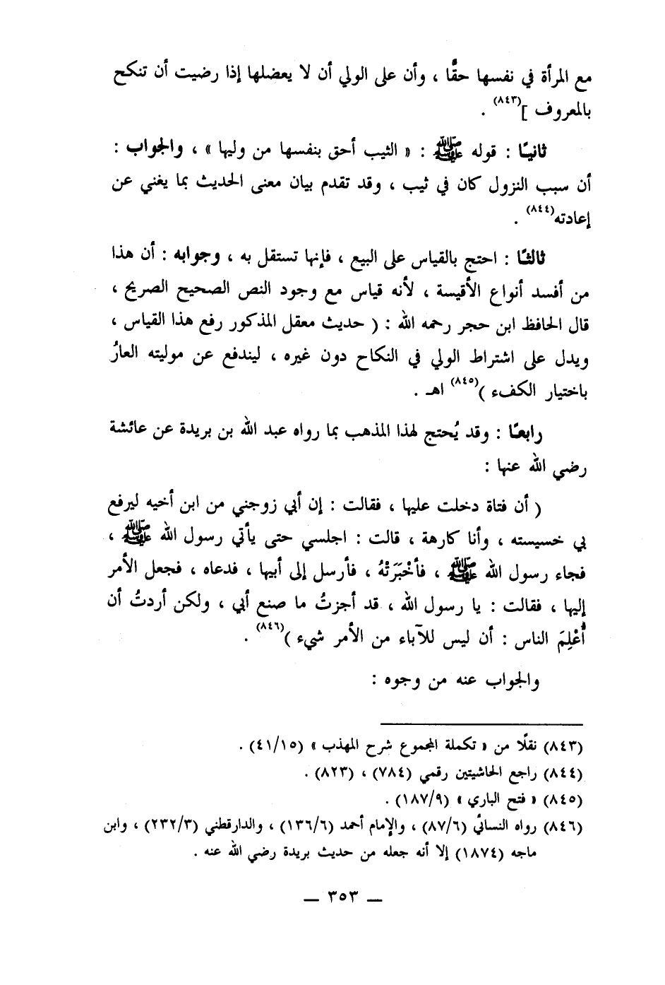 ثانيا: قوله صلى الله عليه وسلم: " الثيب أحق بنفسها من وليها "، والجواب: أن سبب النزول كان في ثيب، وقد تقدم بيان معنى الحديث بما يغني عن إعادته (844) .