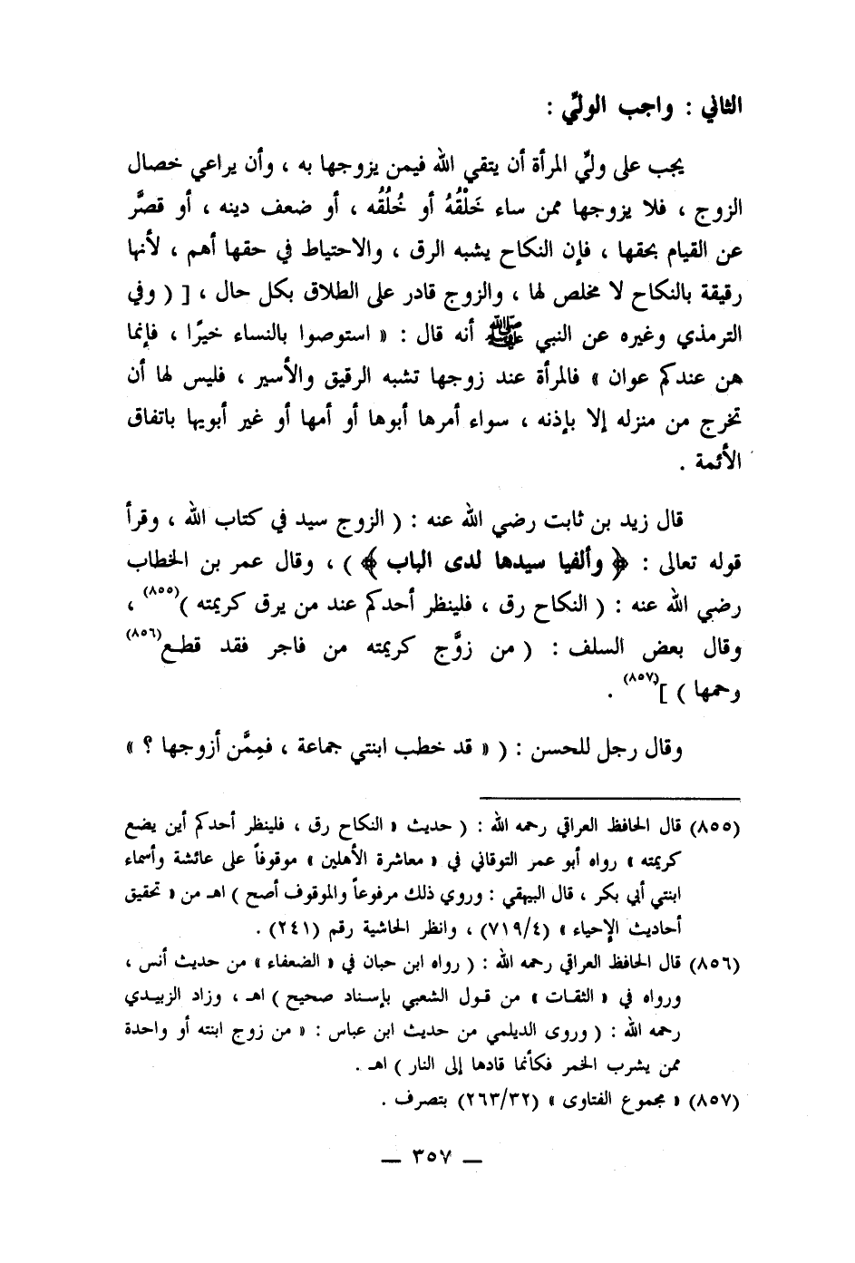 قال زيد بن ثابت رضي الله عنه: (الزوج سيد في كتاب الله، وقرأ قوله تعالى: (وألفيا سيدها لدى الباب)) ، وقال عمر بن الخطاب رضي الله عنه: (النكاح رق، فلينظر أحدكم عند من يرق كريمته (855) ، وقال يعض السلف: (من زوج كريمته من فاجر فقد قطع (856) رحمها) ] (857) .