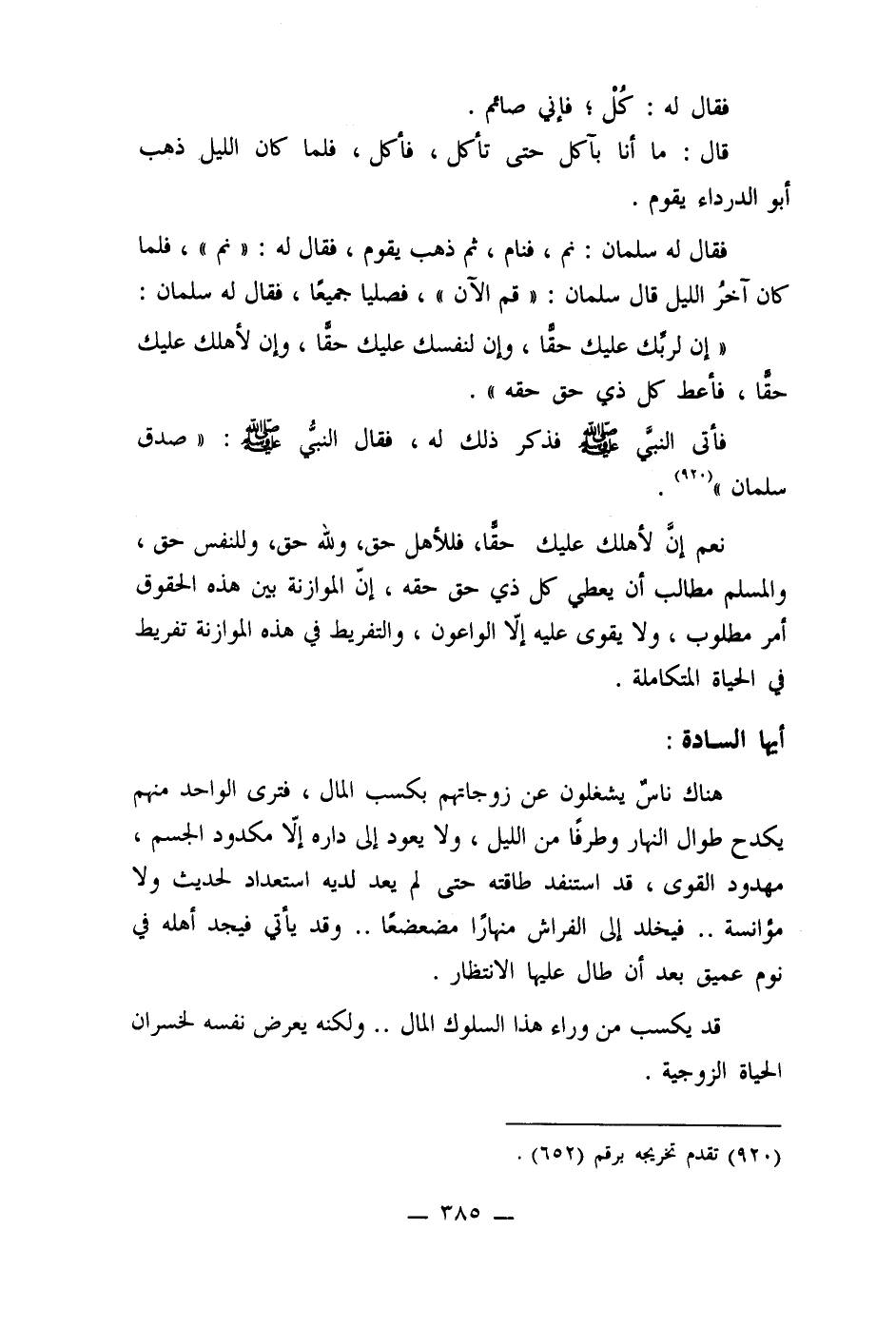 فقال له سلمان: نم، فنام، ثم ذهب يقوم، فقال له: " نم"، فلما كان آخرُ الليل قال سلمان: (قم الآن) ، فصليا جميعًا، فقال له سلمان: " إن لربِّك عليك حقا، وإن لنفسك عليك حقا، وإن لأهلك عليك حقا، فأعط كل ذي حق حقه ".