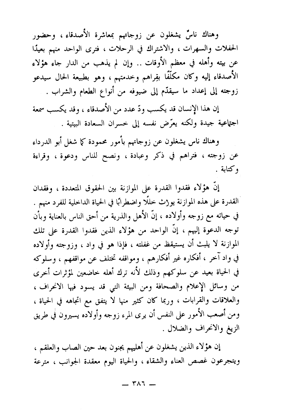 في حياته مع زوجه وأولاده، إن الأهل والذرية من أحق الناس بالعناية وبأن توجه الدعوة إليهم، إن الواحد من هؤلاء الذين فقدوا القدرة على تلك الموازنة لا يلبث أن يستيقظ من غفلته، فإذا هو في واد، وزوجته وأولاده في واد آخر، أفكاره غير أفكارهم، ومواقفه تختلف عن مواقفهم، وسلوكه في الحياة بعيد عن سلوكهم وذلك لأنه ترك أهله خاضعين لمؤثرات أخرى من وسائل الإعلام والصحافة ومن البيئة التي قد يسود فيها الانحراف، والعلاقات والقرابات، وربما كان كثير منها لا يتفق مع اتجاهه في الحياة، ومن أصعب الأمور على النفس أن يرى المرء زوجه وأولاده يسيرون في طريق الزيغ والانحراف والضلال.