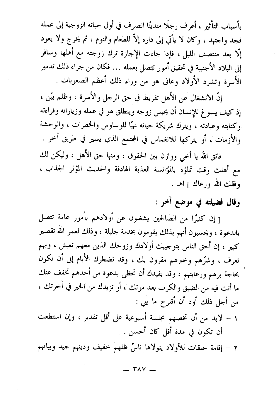 [إن كثيرًا من الصالحين يشغلون عن أولادهم بأمور عامة تتصل بالدعوة، ويحسبون أنهم بذلك يقومون بخدمة جليلة، وذلك لعمر الله تقصير كبير، إن أحق الناس بتوجيهك أولادك وزوجك الذين معهم تعيش، وبهم تعرف، وشرهم وخيرهم مقرون بك، وقد تضطرك الأيام إلى أن تكون بحاجة برهم: ورعايتهم، وقد يفيدك أن تحظى بدعوة من أحدهم تخفف عنك ما أنت فيه من الضيق والكرب بعد موتك، أو تزيدك من الخير في آخرتك، من أجل ذلك أود أن أقترح ما يلي: