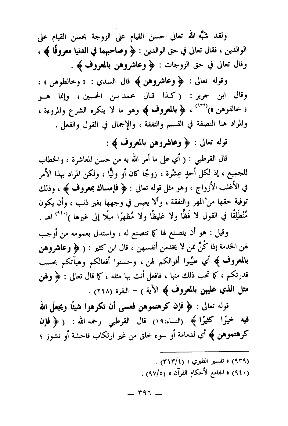 قال القرطبي: (أي على ما أمر الله به من حسن المعاشرة، والخطاب للجميع، إذ لكل أحد عِشْرة، زوجًا كان أو وليًّا، ولكن المراد بهذا الأمر في الأغلب الأزواج، وهو مثل قوله تعالى: (فإمساك بمعروف) ، وذلك توفية حقها من المهر والنفقة، وألا يعبِس في وجهها بغير ذنب، وأن يكون مُنطَلِقًا في القول لا فَظا ولا غليظًا ولا مُظهرًا ميلًا إلى غيرها) (940) اهـ.