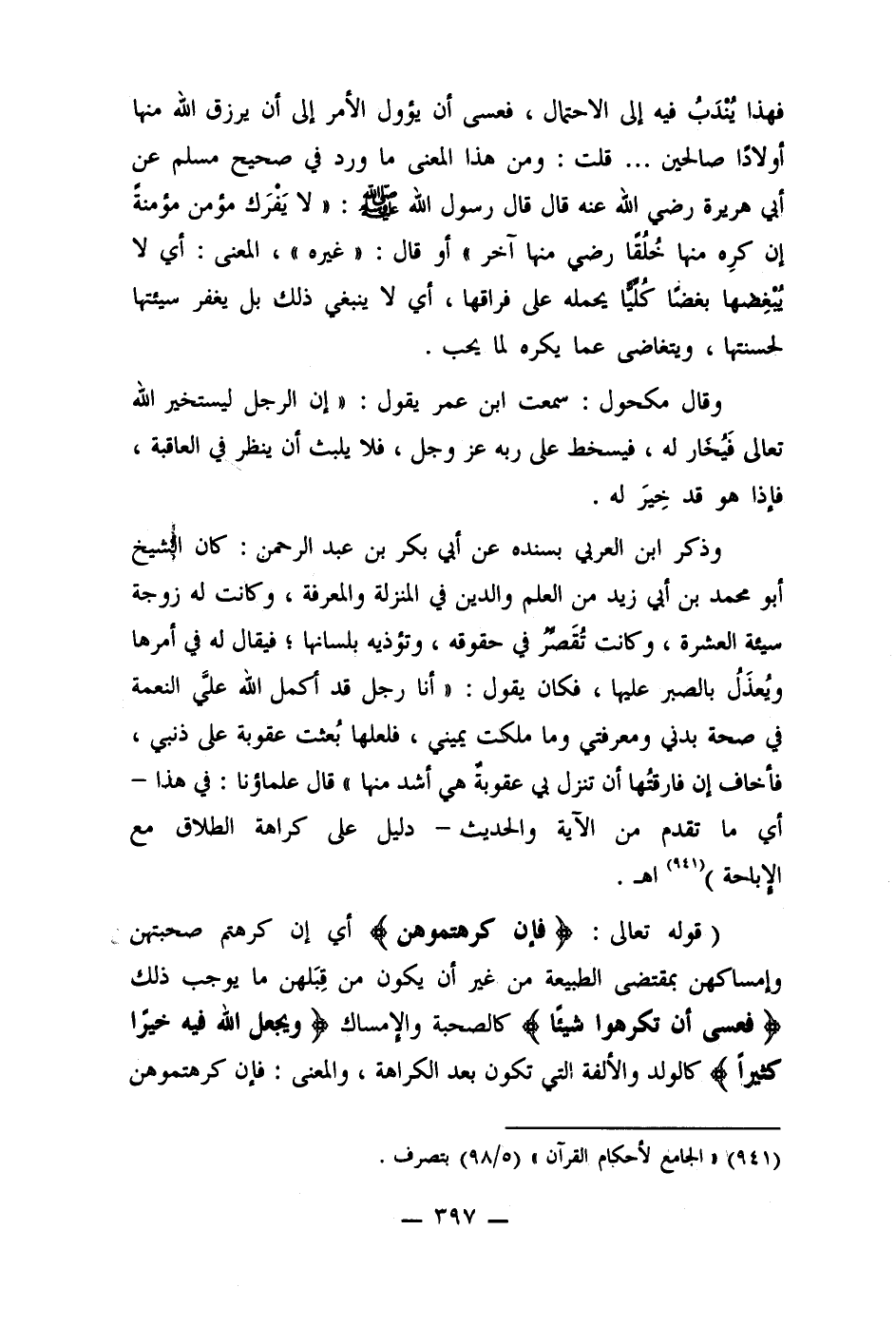 وذكر ابن العربي بسنده عن أبي بكر بن عبد الرحمن: كان الشيخ أبو محمد بن أبي زيد من العلم والدين في المنزلة والمعرفة، وكانت له زوجة سيئة العشرة، وكانت تُقَصر في حقوقه، وتؤذيه بلسانها؛ فيقال له في أمرها ويُعذَلُ بالصبر عليها، فكان يقول: " أنا رجل قد أكمل الله علي النعمة في صحة بدني ومعرفتي وما ملكت يميني، فلعلها بُعثت عقوبة على ذنبي، فأخاف إن فارقتها أن تنزل بي عقوبة هي أشد منها " قال علماؤنا: في هذا - أي ما تقدم من الآية والحديث - دليل على كراهة الطلاق مع الإباحة) (941) اهـ.