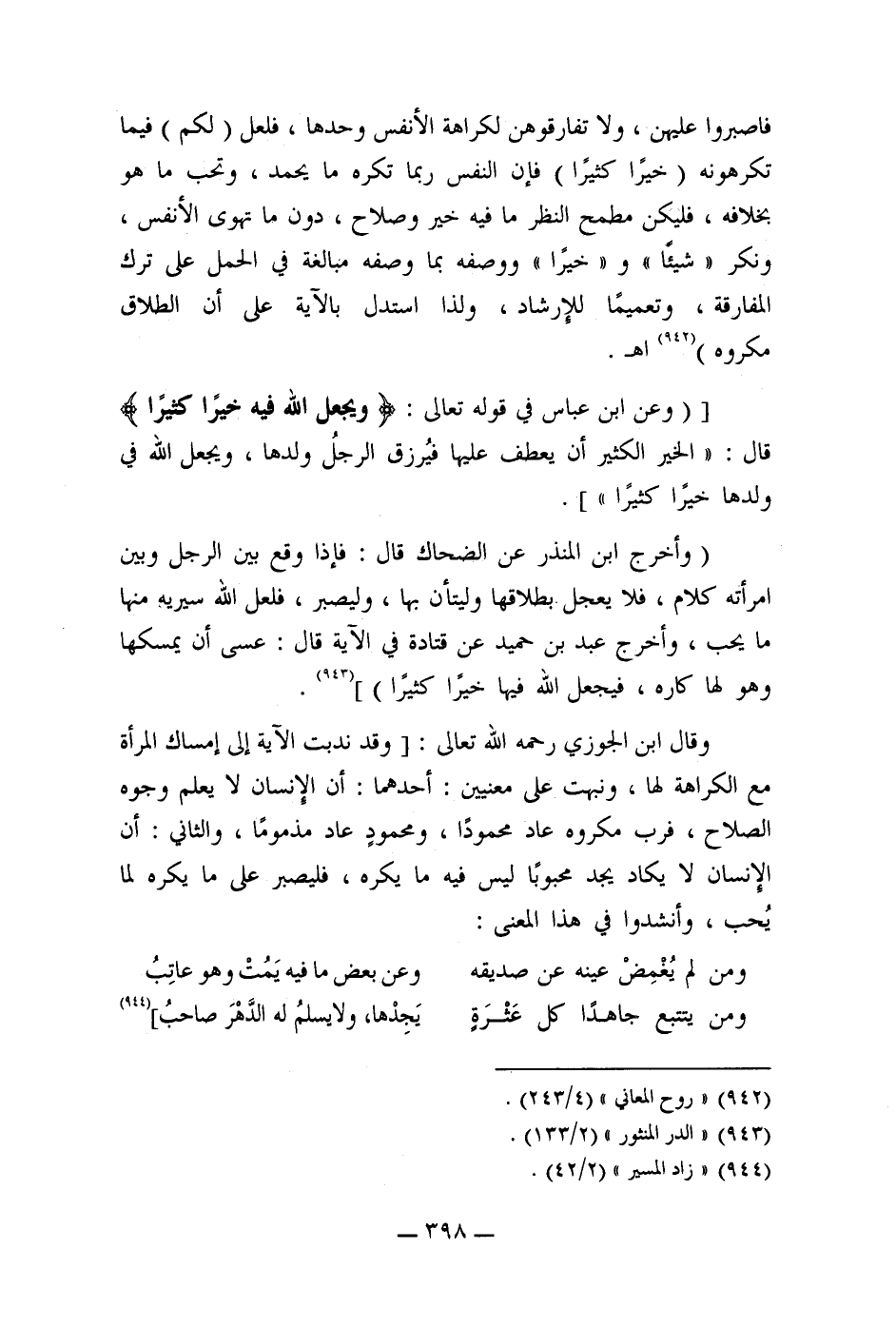 وقال ابن الجوزي رحمه الله تعالى: [وقد ندبت الآية إلى إمساك المرأة مع الكراهة لها، ونبهت على معنيين: أحدهما: أن الإنسان لا يعلم وجوه الصلاح، فرب مكروه عاد محمودًا، ومحمودٍ عاد مذموما، والثاني: أن الإنسان لا يكاد يجد محبوبًا ليس فيه ما يكره، فليصبر على ما يكره لما يُحب، وأنشدوا في هذا المعنى:
