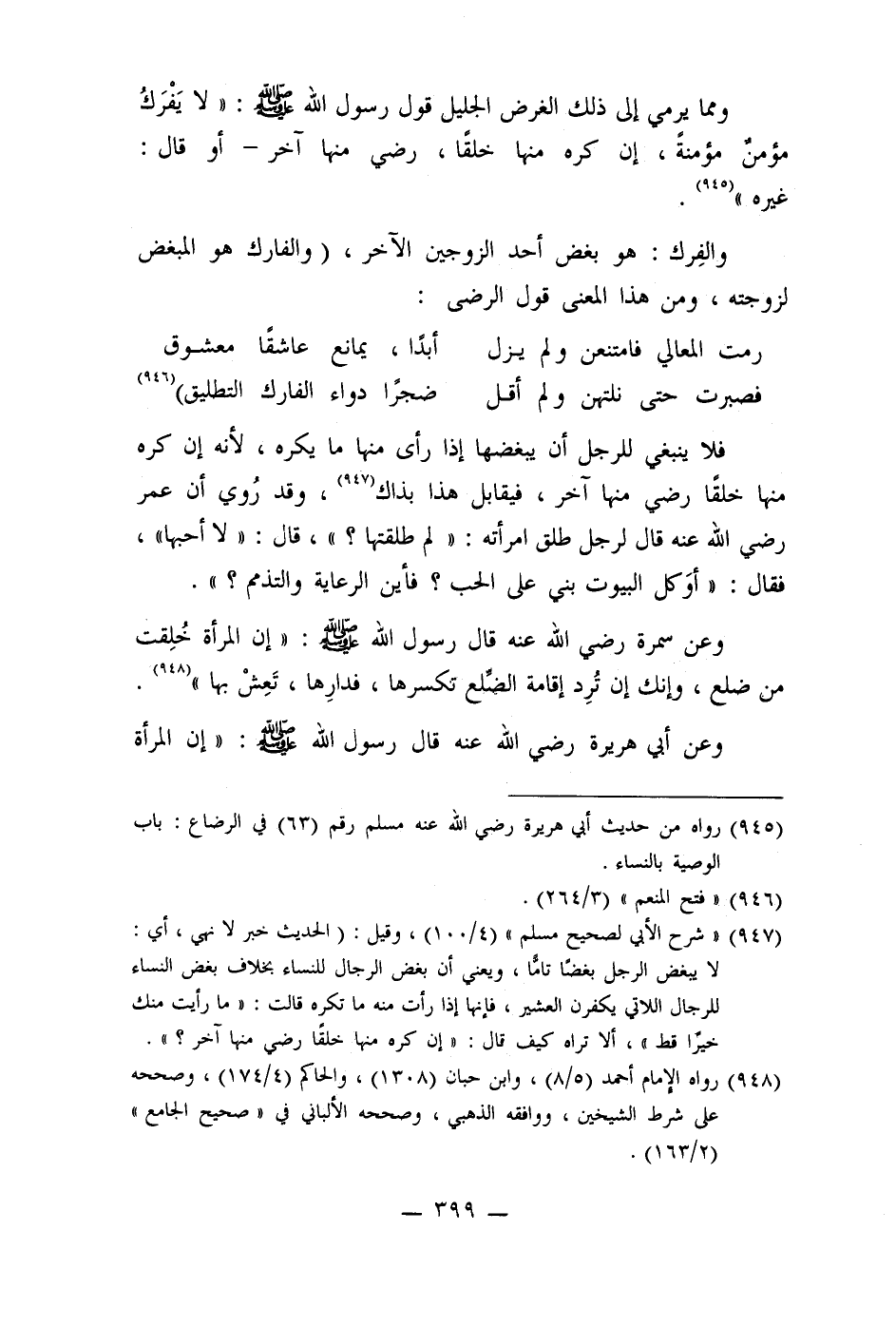 ومما يرمي إلى ذلك الغرض الجليل قول رسول الله صلى الله عليه وسلم: " لا يَفْرَكُ مؤمن مؤمنةً، إن كره منها خلقًا، رضي منها آخر - أو قال: غيره " (945) .
