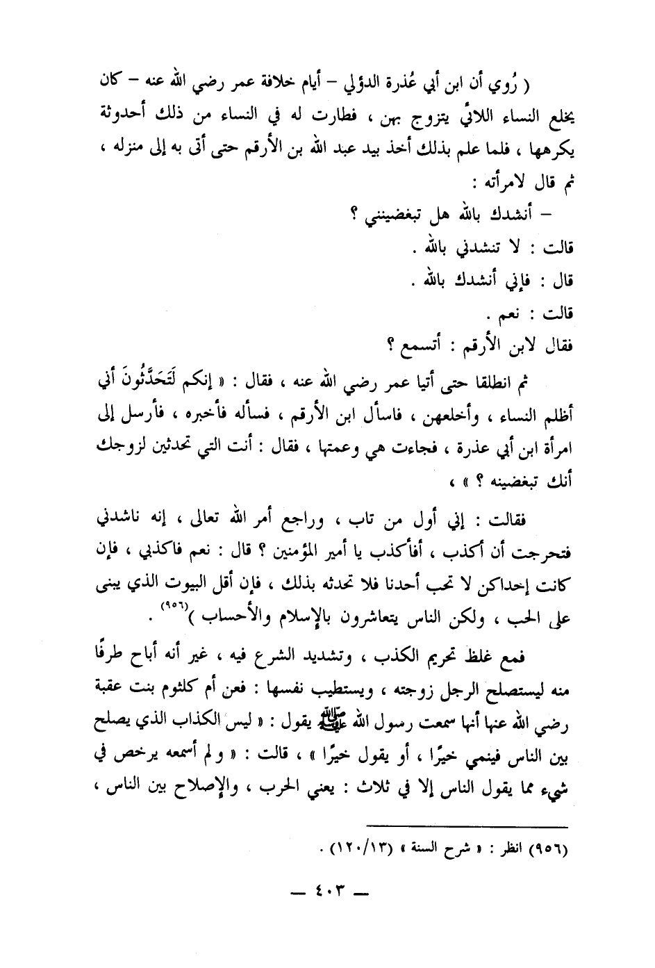 فقالت: إني أول من تاب، وراجع أمر الله تعالى، إنه ناشدني فتحرجت أن أكذب، أفأكذب يا أمير المؤمنين؟ قال: نعم فاكذبي، فإن كانت إحداكن لا تحب أحدنا فلا تحدثه بذلك، فإن أقل البيوت الذي يبنى على الحب، ولكن الناس يتعاشرون بالإسلام والأحساب) (956) .