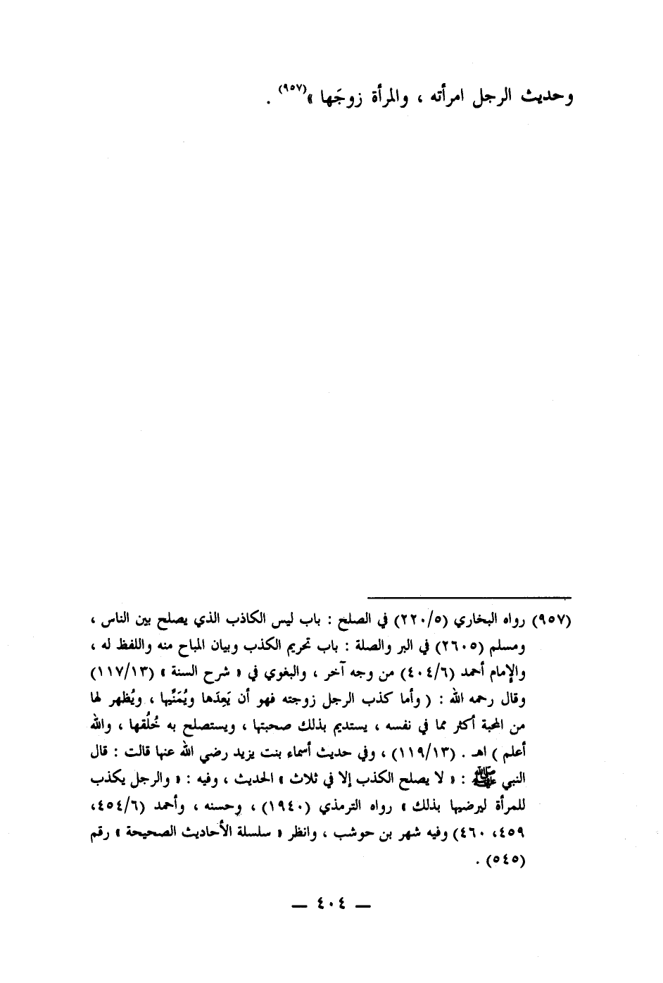 (957) رواه البخاري (5/220) في الصلح: باب ليس الكاذب الذي يصلح بين الناس، ومسلم (2605) في البر والصلة: باب تحريم الكذب وبيان المباح منه واللفظ له، والإمام أحمد (6/404) من وجه آخر، والبغوي في " شرح السنة" (13/117) وقال رحمه الله: (وأما كذب الرجل زوجته فهو أن يعددَها ويمنيها، ويظهر لها من المحبة أكثر مما في نفسه، يستديم بذلك صحبتها، ويستصلح به خلُقها، والله أعلم) اهـ. (13/119) ، وفي حديث أسماء بنت في يزيد رضي الله عنها قالت: قال النبي صلى الله عليه وسلم: " لا يصلح الكذب إلا في ثلاث" الحديث، وفيه: " والرجل يكذب للمرأة ليرضيها بذلك" رواه الترمذي (1940) ، وحسنه، وأحمد (6/454، 459، 460) وفيه شهر بن حوشب، وانظر " سلسلة الأحاديث الصحيحة" رقم (545)