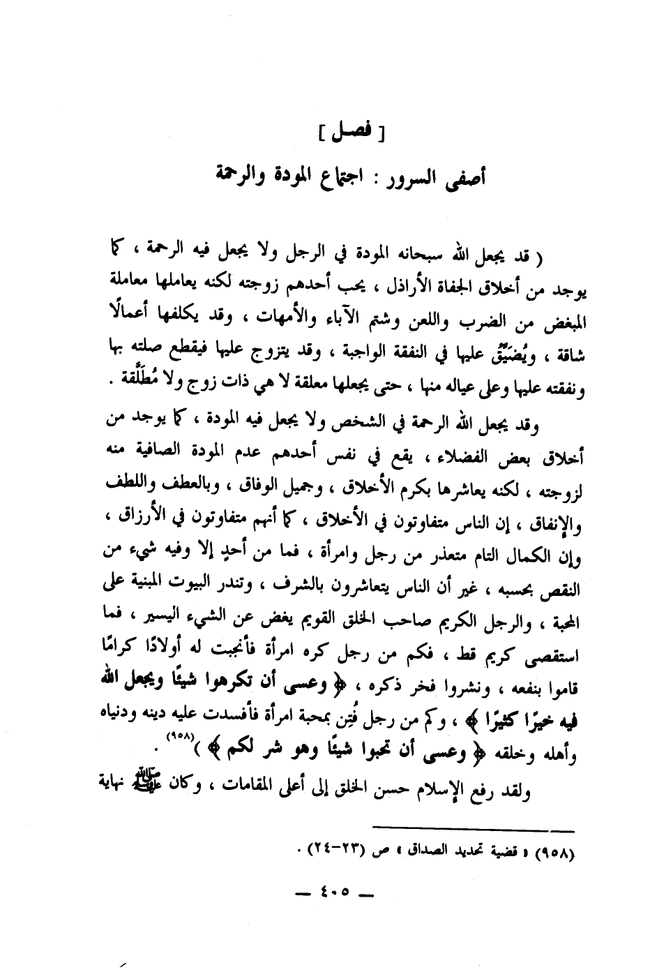 وقد يجعل الله الرحمة في الشخص ولا يجعل فيه المودة، كما يوجد من أخلاق بعض الفضلاء، يقع في نفس أحدهم عدم المودة الصافية منه لزوجته، لكنه يعاشرها بكرم الأخلاق، وجميل الوفاق، وبالعطف واللطف والإنفاق، إن الناس متفاوتون في الأخلاق، كما أنهم متفاوتون في الأرزاق، وان الكمال التام متعذر من رجل وامرأة، فما من أحد إلا وفيه شيء من النقص بحسبه، غير أن الناس يتعاشرون بالشرف، وتندر البيوت المبنية على المحبة، والرجل الكريم صاحب الخلق القويم يغض عن الشيء اليسير، فما استقصى كريم قط، فكم من رجل كره امرأة فأنجبت له أولادا كرامًا قاموا بنفعه، ونشروا فخر ذكره، (وعسى أن تكرهوا شيئا ويجعل الله فيه خيرًا كثيرَا) ، وكم من رجل فُتِن بمحبة امرأة فأفسدت عليه دينه ودنياه وأهله وخلقه (وعسى أن تحبوا شيئَا وهو شر لكم)) (958) .