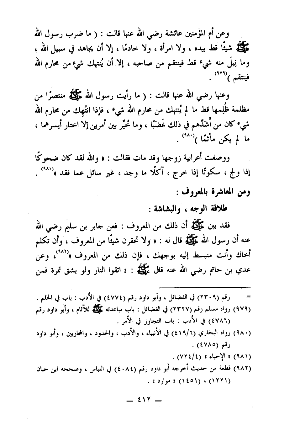 وعن أم المؤمنين عائشة رضي الله عنها قالت: (ما ضرب رسول الله صلى الله عليه وسلم شيئًا قط بيده، ولا امرأة، ولا خادما، إلا أن يجاهد في سبيل الله، وما نِيلَ منه شيء قط فينتقم من صاحبه، إلا أن يُنتهك شيء من محارم الله فينتقم) (979) .