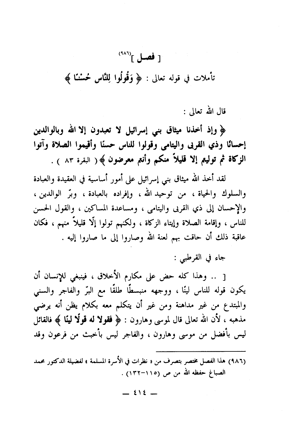 (وإذ أخذنا ميثاق بني إسرائيل لا تعبدون إلا الله وبالوالدين إحسانا وذي القربى واليتامى وقولوا للناس حسنًا وأقيموا الصلاة وآتوا الزكاة ثم توليتم إلا قليلاً منكم وأنتم معرضون) (البقرة 83) .