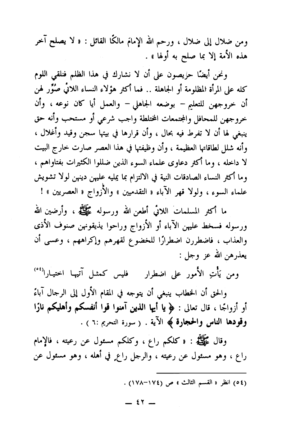 ونحن أيضا حريصون على أن لا نشارك في هذا الظلم فنلقي اللوم كله على المرأة المظلومة أو الجاهلة.. فما أكثر هؤلاء النساء اللائي صُوِّر لهن أن خروجهن للتعليم - بوضعه الجاهلي - والعمل أيا كان نوعه، وأن خروجهن للمحافل والمجتمعات المختلطة واجب شرعي أو مستحب وأنه حق ينبغي لها أن لا تفرط فيه بحال، وأن قرارها في بيتها سجن وقيد وأغلال، وأنه شلل لطاقاتها العظيمة، وأن وظيفتها في هذا العصر صارت خارج البيت لا داخله، وما أكثر دعاوى علماء السوء الذين ضللوا الكثيرات بفتاواهم، وما أكثر النساء الصادقات النية في الالتزام بما يمليه عليهن دينهن لولا تشويش علماء السوء، ولولا قهر الآباء " التقدميين " والأزواج "العصريين"!