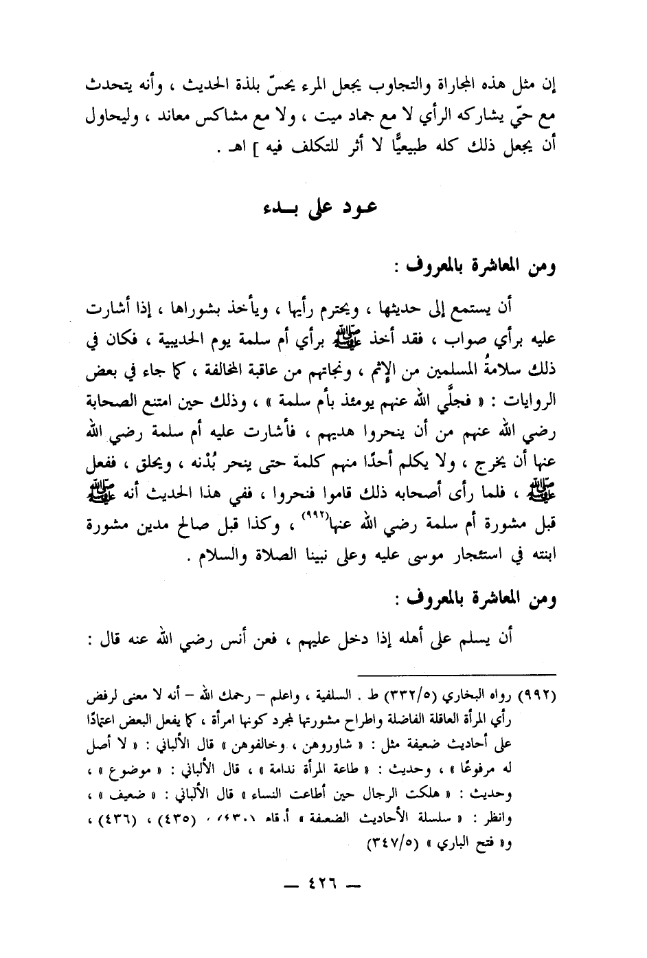 (992) رواه البخاري (5/332) ط. السلفية، واعلم - رحمك الله - أنه لا معنى لرفض رأي المرأة العاقلة الفاضلة واطراح مشورتها لمجرد كونها امرأة، كما يفعل البعض اعتمادا على أحاديث ضعيفة مثل: " شاوروهن، وخالفوهن " قال الألباني: " لا أصل له مرفوعا "، وحديث: (طاعة المرأة ندامة"، قال الألباني: " موضوع"، وحديث: " هلكت الرجال حين أطاعت النساء " قال الألباني: " ضعيف "، وانظر: " سلسلة الأحاديث الضعيفة" أرقام (430) ، (435) ، (436) ، و"فتح الباري" (5/347) .