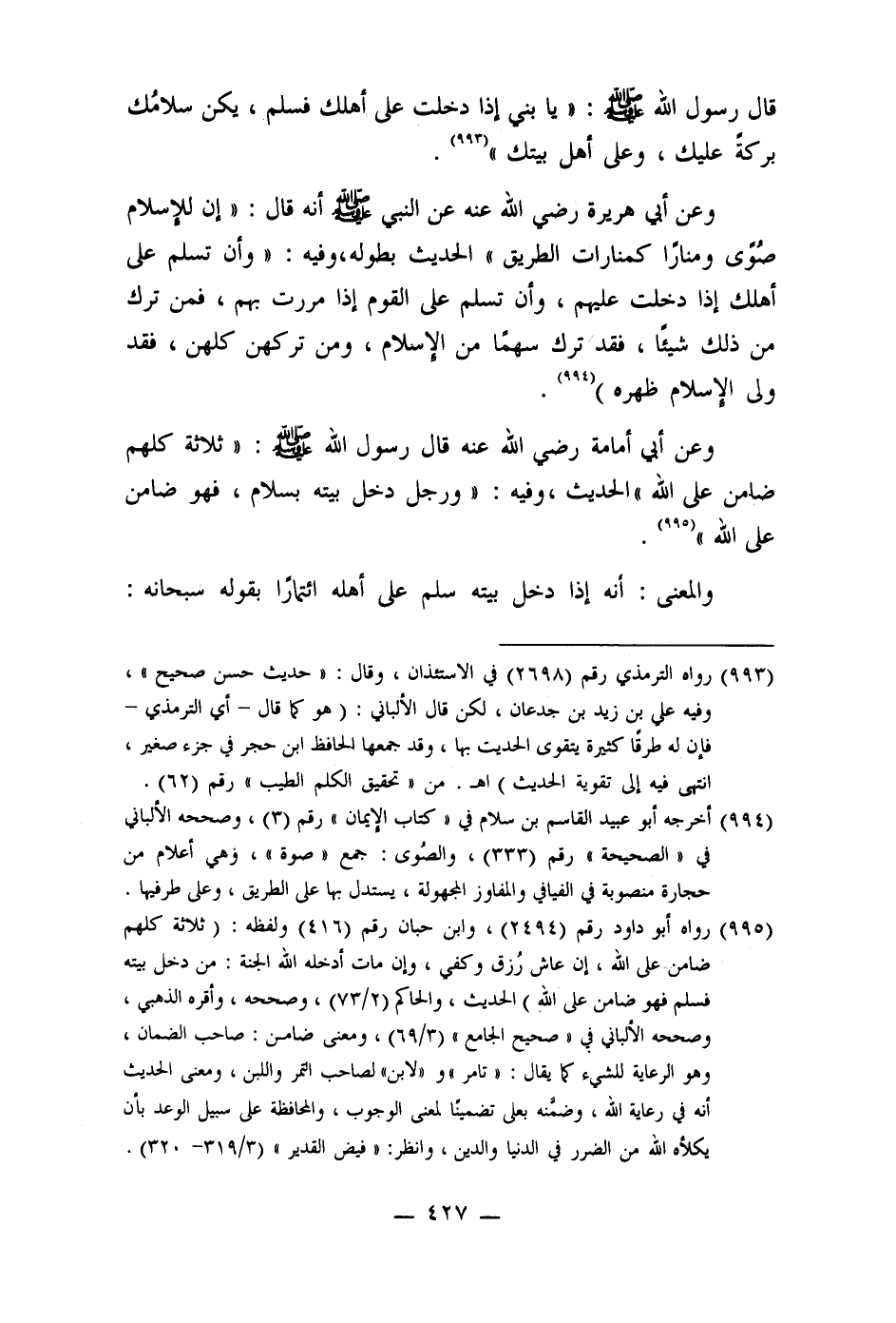 وعن أبي أمامة رضي الله عنه قال رسول الله صلى الله عليه وسلم: " ثلاثة كلهم ضامن علي الله، الحديث، وفيه: " ورجل دخل بيته بسلام، فهو ضامن على الله " (995) .