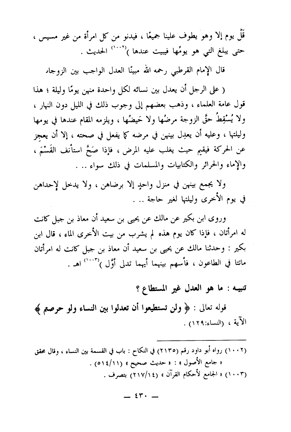 قال الإمام القرطبي رحمه الله مبينًا العدل الواجب بين الزوجات: (على الرجل أن يعدل بين نسائه لكل واحدة منهن يوما وليلة؛ هذا قول عامة العلماء، وذهب بعضهم إلى وجوب ذلك في الليل دون النهار، ولا يُسقِطُ حقَّ الزوجة مرضُها ولا حَيضها، ويلزمه المقام عندها في يومها وليلتها، وعليه أن يعدِل بينهن في مرضه كما يفعل في صحته، إلا أن يعجِز عن الحركة فيقيم حيث يغلب عليه المرض، فإذا صَح استأنف القَسمَ، والإماء والحرائر والكتابيات والمسلمات في ذلك سواء ...