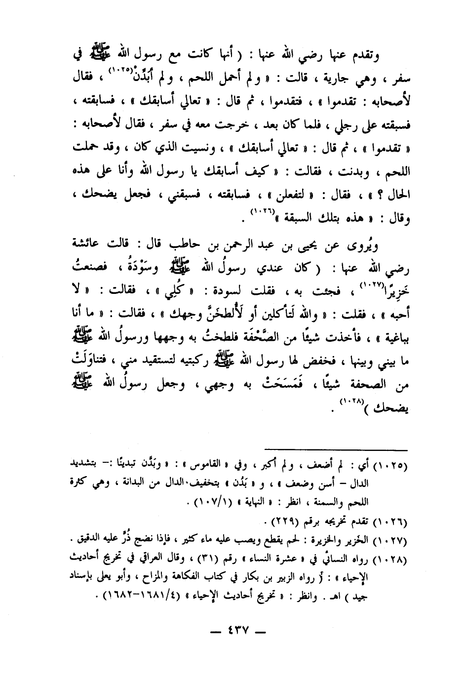 وتقدم عنها رضي الله عنها: (أنها كانت مع رسول الله صلى الله عليه وسلم في سفر، وهي جارية، قالت: " ولم أحمل اللحم، ولم أبدِّن (1025) ، فقال لأصحابه: تقدموا "، فتقدموا، ثم قال: " تعالي أسابقك "، فسابقته، فسبقته على رجلي، فلما كان بعد، خرجت معه في سفر، فقال لأصحابه: " تقدموا"، ثم قال: " تعالي أسابقك "، ونسيت الذي كان، وقد حملت اللحم، وبدنت، فقالت: " كيف أسابقك يا رسول الله وأنا على هذه الحال؟ "، فقال: " لتفعلن"، فسابقته، فسبقني، فجعل يضحك، وقال: " هذه بتلك السبقة " (1026) .