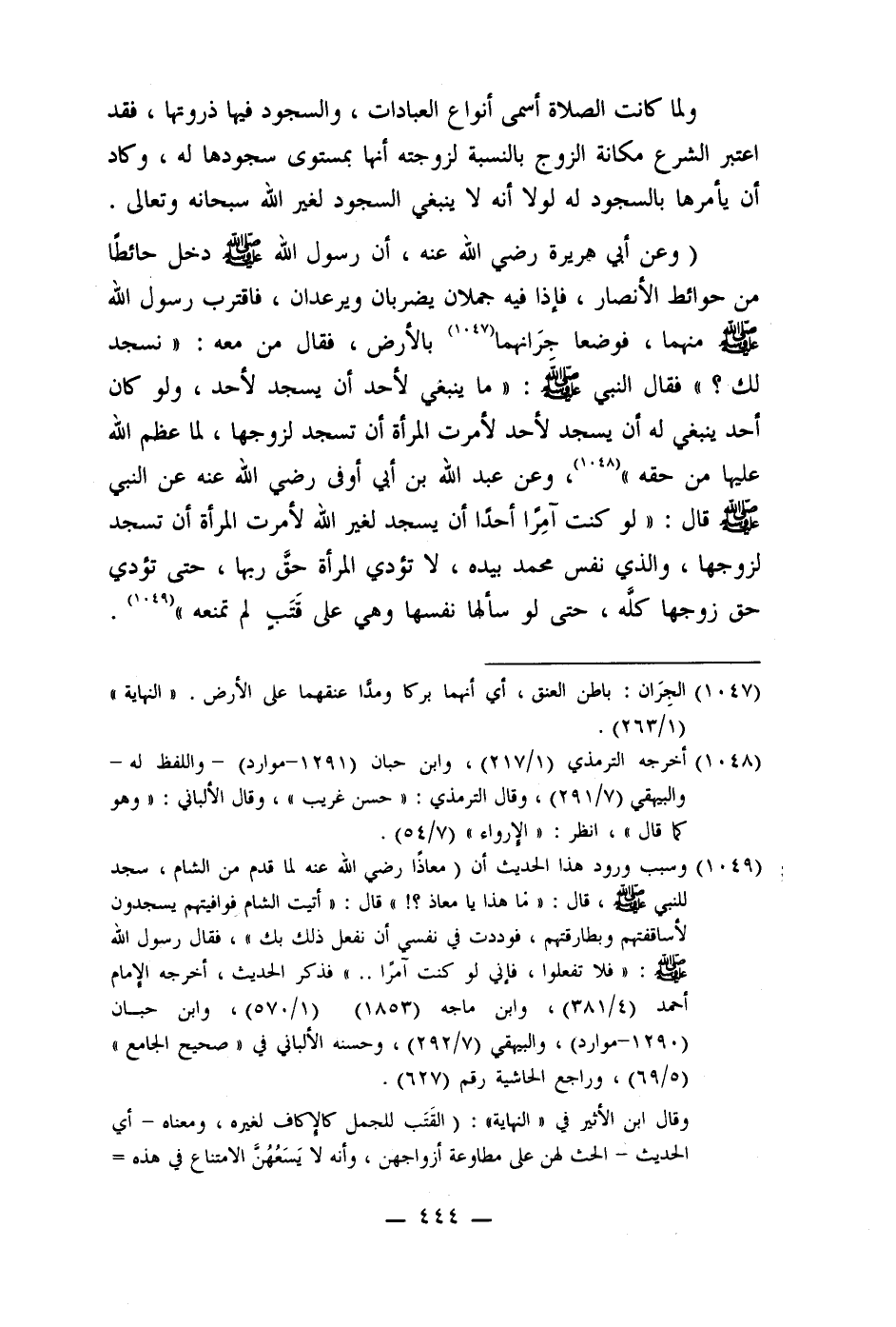 ولما كانت الصلاة أسمى أنواع العبادات، والسجود فيها ذروتها، فقد اعتبر الشرع مكانة الزوج بالنسبة لزوجته أنها بمستوى سجودها له، وكاد أن يأمرها بالسجود له لولا أنه لا ينبغي السجود لغير الله سبحانه وتعالى. (وعن أبي هريرة رضي الله عنه، أن رسول الله صلى الله عليه وسلم دخل حائطًا من حوائط الأنصار، فإذا فيه جملان يضربان ويرعدان، فاقترب رسول الله صلى الله عليه وسلم منهما، فوضعا جرَانهما (1047) بالأرض، فقال من معه: " نسجد لك؟ " فقال النبي صلى الله عليه وسلم: " ما ينبغي لأحد أن يسجد لأحد، ولو كان أحد ينبغي له أن يسجد لأحد لأمرت المرأة أن تسجد لزوجها، لما عظم الله عليها من حقه " (1048) ، وعن عبد الله بن أبي أوفى رضي الله عنه عن النبي صلى الله عليه وسلم " قال: " لو كنت آمِرًا أحدا أن يسجد لغير الله لأمرت المرأة أن تسجد لزوجها، والذي نفس محمد بيده، لا تؤدي المرأة حق ربها، حتى تؤدي حق زوجها كلَّه، حتى لو سألها نفسها وهي على قَتَب لم تمنعه " (1049) .
