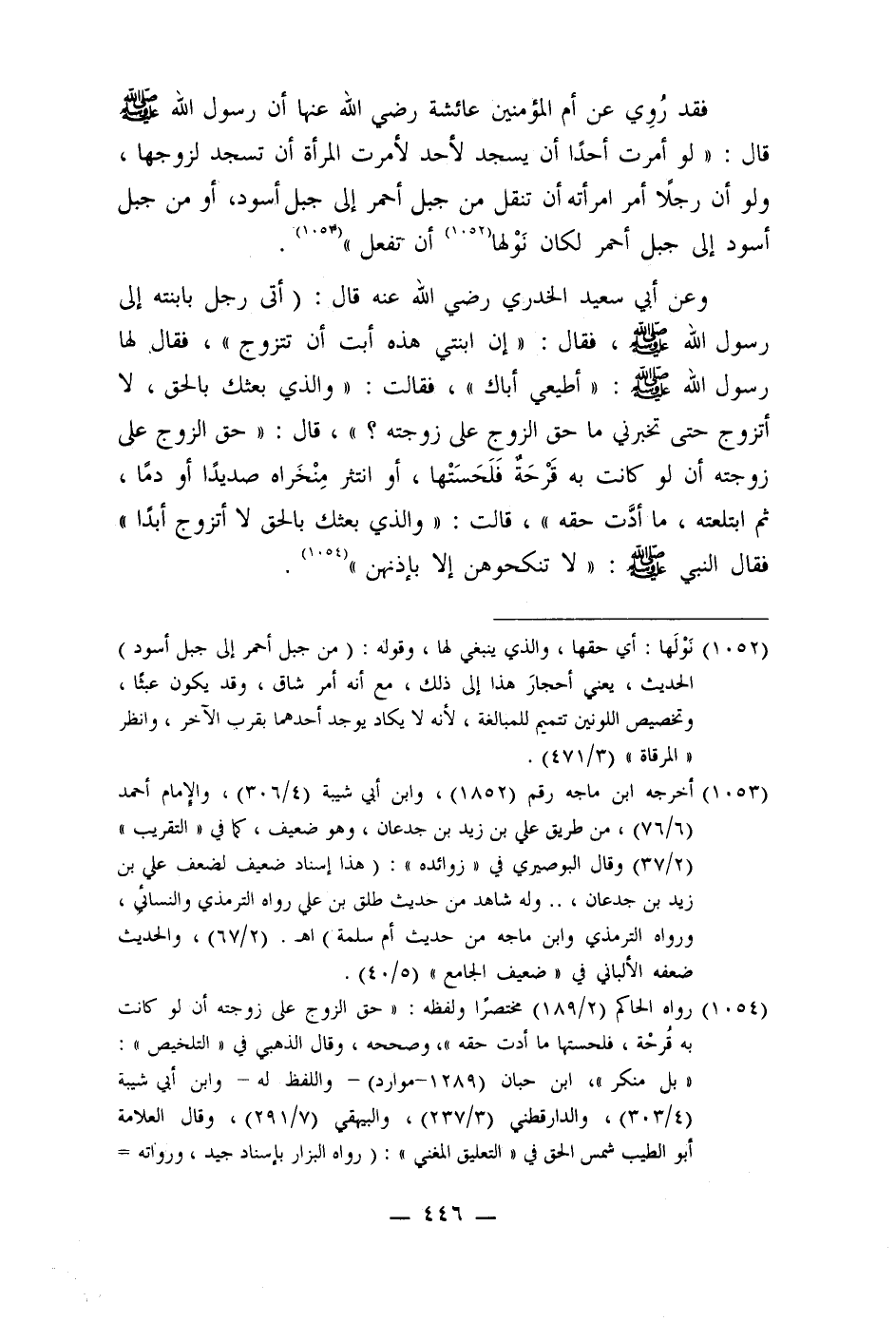 وعن أبى سعيد الخدري رضي الله عنه قال: (أتى رجل بابنته إلى رسول الله صلى الله عليه وسلم، فقال: " إن ابنتي هذه أبت أن تتزوج "، فقال لها رسول الله صلى الله عليه وسلم: " أطيعي أباك "، فقالت: " والذي بعثك بالحق، لا أتزوج حتى تخبرني ما حق الزوج على زوجته؟ "، قال: " حق الزوج على زوجته أن لو كانت به قَرْحَة فَلَحَسَتْها، أو انتثر مِنْخَراه صديدًا أو دما، ثم ابتلعته، ما أدَت حقه "، قالت: " والذي بعثك بالحق لا أتزوج أبدا " فقال النبي صلى الله عليه وسلم: " لا تنكحوهن إلا بإذنهن " (1054) .