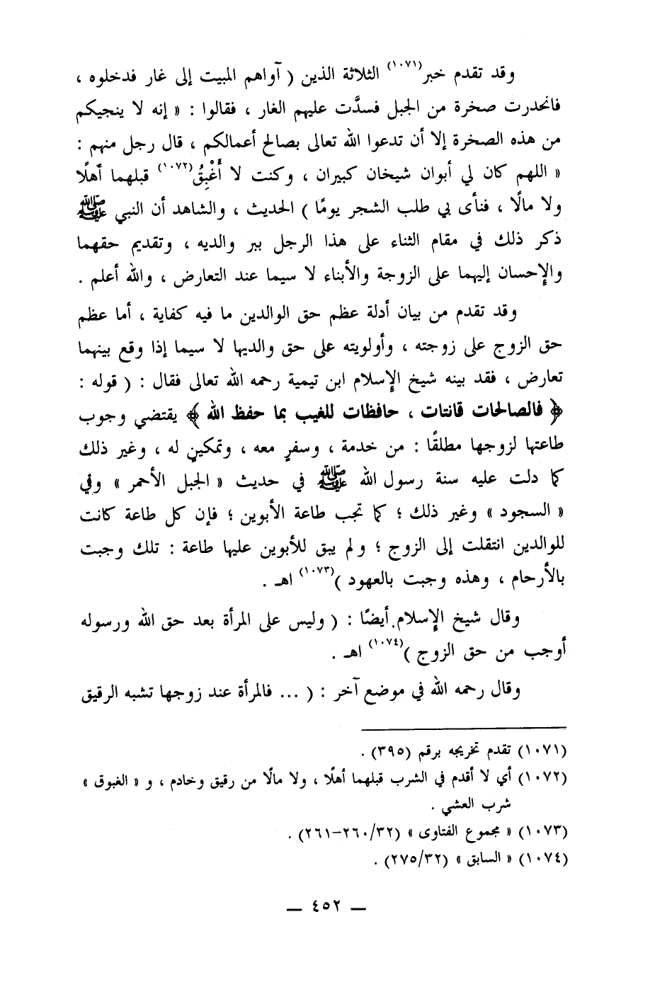 وقال شيخ الإسلام أيضًا: (وليس على المرأة بعد حق الله ورسوله أوجب من حق الزوج) (1074) اهـ.