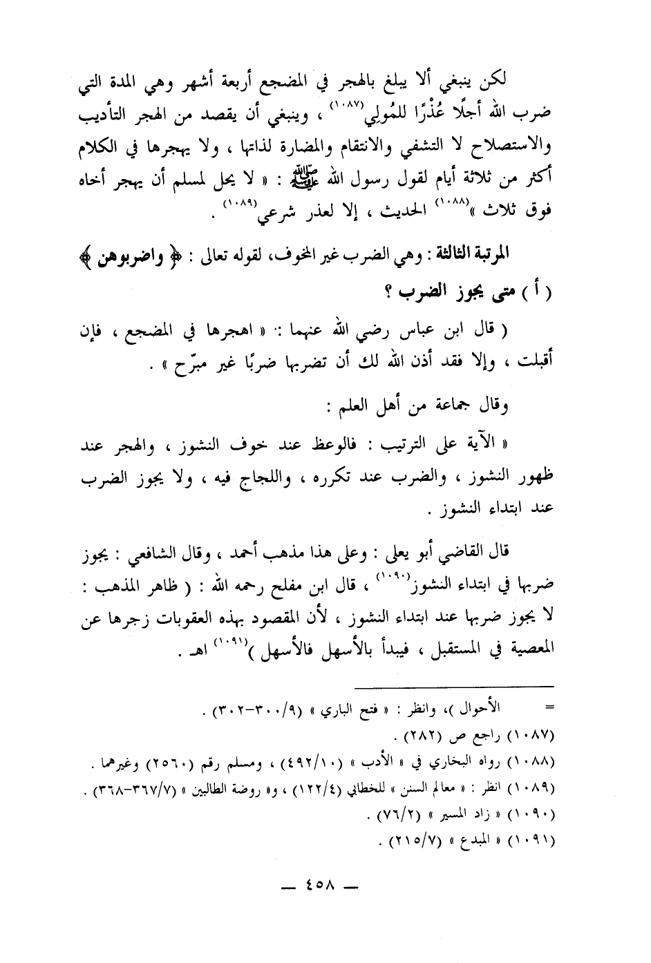 لكن ينبغي ألا يبلغ بالهجر في المضجع أربعة أشهر وهي المدة التي ضرب الله أجلًا عُذْرًا للمُولِي (1087) ، وينبغي أن يقصد من الهجر التأديب والاستصلاح لا التشفي والانتقام والمضارة لذاتها، ولا يهجرها في الكلام أكثر من ثلاثة أيام لقَول رسول الله صلى الله عليه وسلم: "لا يحل لمسلم أن يهجر أخاه فوق ثلاث " (1088) الحديث، إلا لعذر شرعي (1089) .