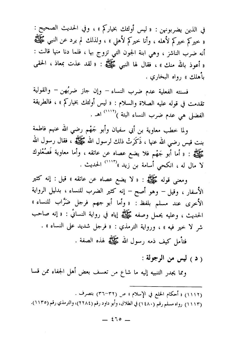 في الذين يضربونهن: " ليس أولئك بخياركم "، وفي الحديث الصحيح: " خيركم خيركم لأهله، وأنا خيركم لأهلي "، ولذلك لم يرد عن النبي صلى الله عليه وسلم أنه ضرب الناشز، وهى ابنة الجون التي تزوج بها، فلما دنا منها قالت: " أعوذ بالله منك"، فقال لها النبي صلى الله عليه وسلم: " لقد عذت بمعاذ، الحقي بأهلك " رواه البخاري.