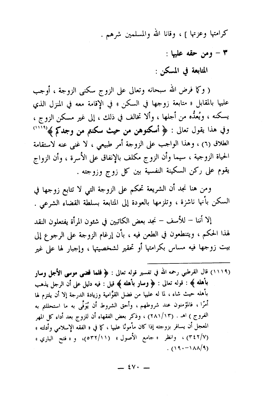 (وكما فرض الله سبحانه وتعالى على الزوج سكنى الزوجة، أوجب عليها بالمقابل " متابعة زوجها في السكن " في الِإقامة معه في المنزل الذي يسكنه، ويُعدُّه من أجلها، وألا تخالف في ذلك، إلى غير مسكن الزوج، وفي هذا يقول تعالى: (أسكنوهن من حيث سكنتم من وجدكم) (1119) الطلاق (6) ، وهذا الواجب على الزوجة أمر طبيعي، لا غنى عنه لاستقامة الحياة الزوجية، سيما وأن الزوج مكلف بالإنفاق على الأسرة، وأن الزواج يقوم على ركن السكينة النفسية بين كل زوج وزوجته.