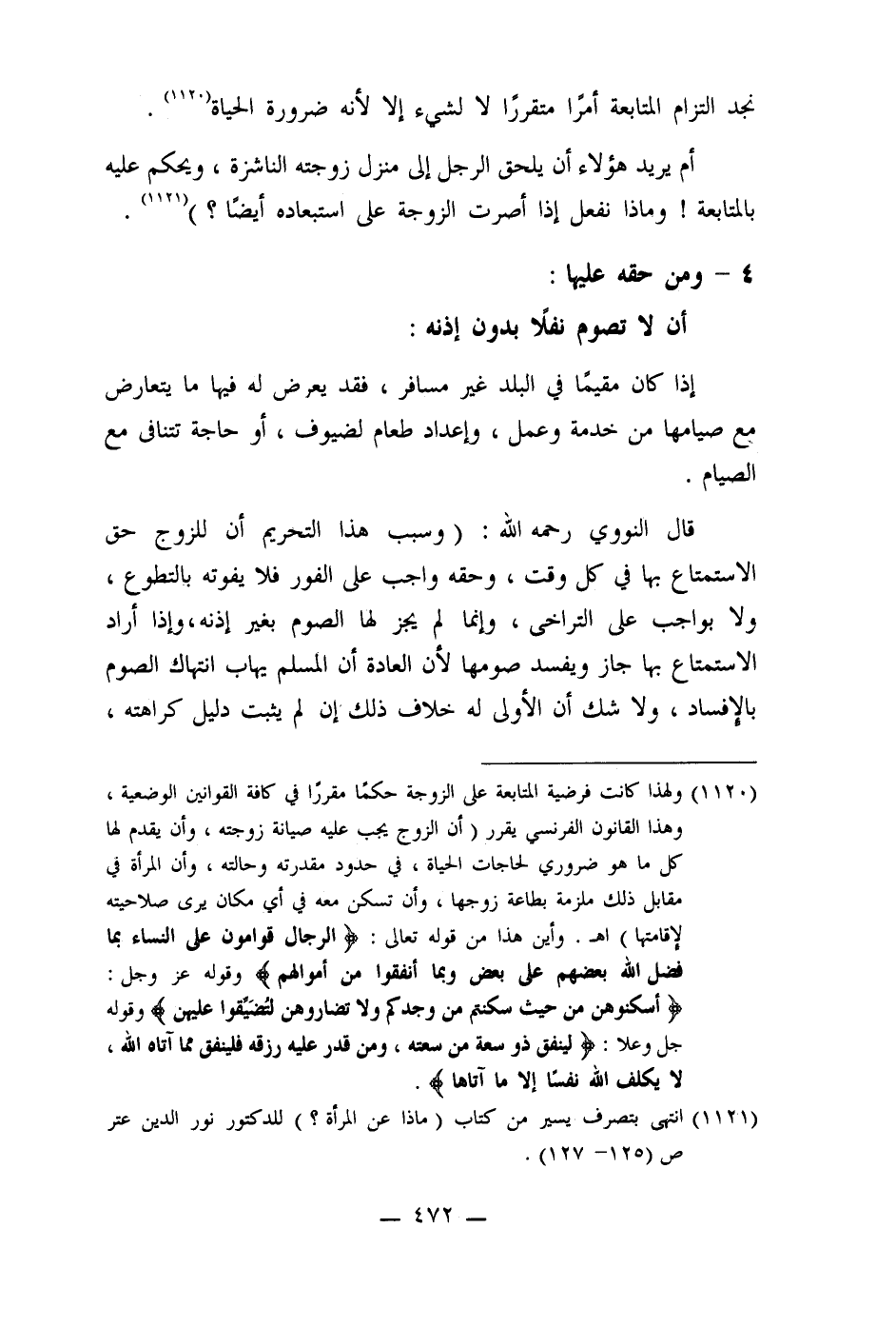 (1120) ولهذا كانت فرضية المتابعة على الزوجة حكمًا مقررا في كافة القوانين الوضعية، وهذا القانون الفرنسي يقرر (أن الزوج يجب عليه صيانة زوجته، وأن يقدم لها كل ما هو ضروري لحاجات الحياة، في حدود مقدرته وحالته، وأن المرأة في مقابل ذلك ملزمة بطاعة زوجها، وأن تسكن معه في أي مكان يرى صلاحيته لإقامتها) اهـ. وأين هذا من قوله تعالى: (الرجال قوامون على النساء بما فضل اللَه بعضهم على بعض وبما أنفقوا من أموالهم) وقوله عز وجل: (أسكنوهن من حيث سكنتم من وجدكم ولا تضاروهن لتضيقوا عليهن) وقوله جل وعلا: (لينفق ذو سعة من سعته، ومن قدر عليه رزقه فلينفق مما آتاه الله، لا يكلف الله نفسًا إلا ما آتاها) .