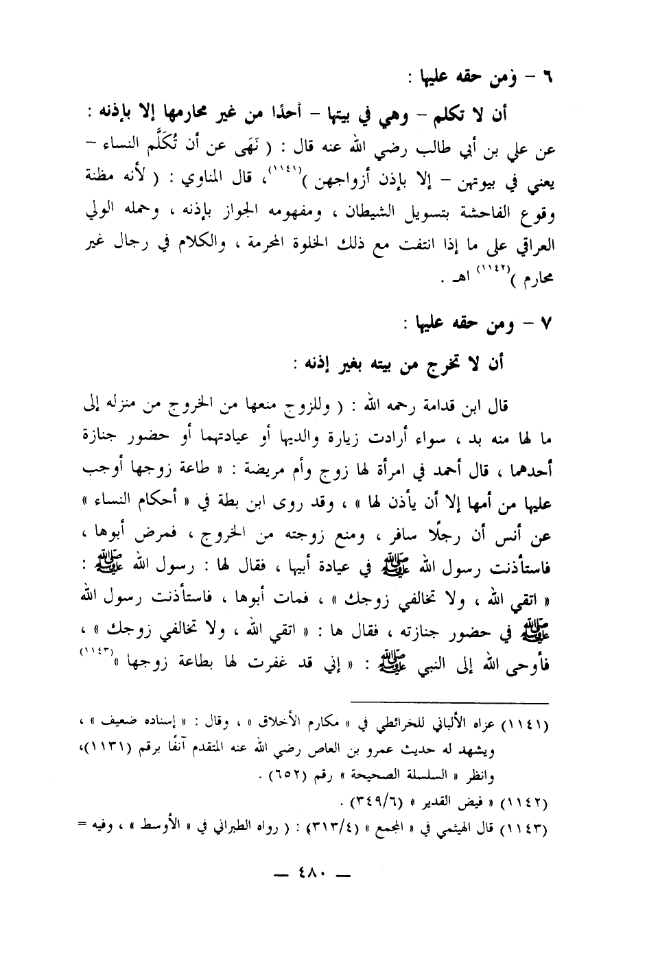 أن لا تكلم - وهي في بيتها - أحدًا من غير محارمها إلا بإذنه: عن علي بن أبي طالب رضي الله عنه قال: (نَهَى عن أن تُكَلَم النساء - يعنى في بيوتهن - إلا بإذن أزواجهن) (1141) ، قال المناوي: " لأنه مظنة وقوع الفاحشة بتسويل الشيطان، ومفهومه الجواز بإذنه، وحمله الولي العراقي على ما إذا انتفت مع ذلك الخلوة المحرمة، والكلام في رجال غير محارم) (1143) اهـ.