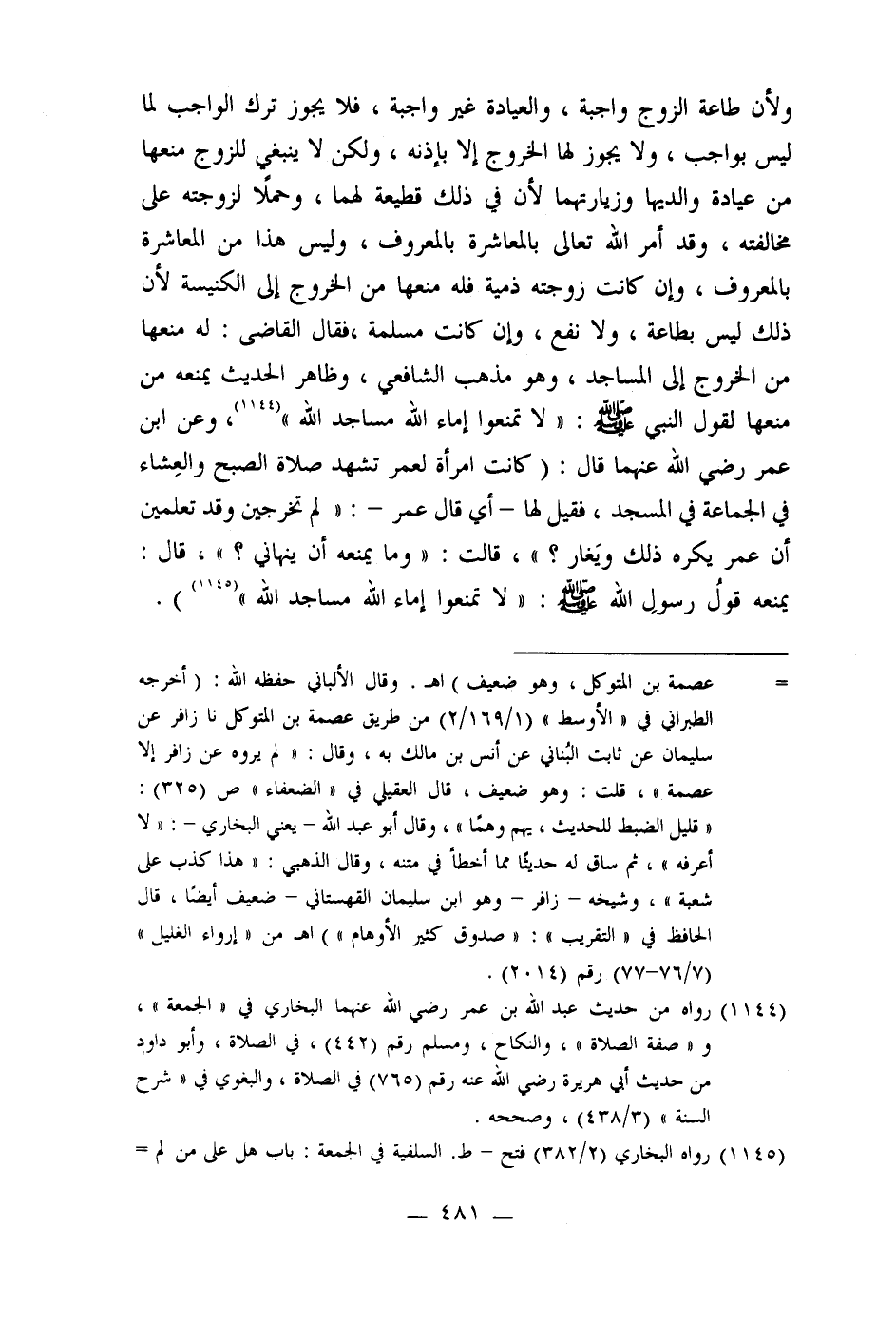 ولأن طاعة الزوج واجبة، والعيادة غير واجبة، فلا يجوز ترك الواجب لما ليس بواجب، ولا يجوز لها الخروج إلا بإذنه، ولكن لا ينبغي للزوج منعها من عيادة والديها وزيارتهما لأن في ذلك قطيعة لهما، وحملًا لزوجته على مخالفته، وقد أمر الله تعالى بالمعاشرة بالمعروف، وليس هذا من المعاشرة بالمعروف، وإن كانت زوجته ذمية فله منعها من الخروج إلى الكنيسة لأن ذلك ليس بطاعة، ولا نفع، وإن كانت مسلمة، فقال القاضي: له منعها من الخروج إلى المساجد، وهو مذهب الشافعي، وظاهر الحديث يمنعه من منعها لقول النبي صلى الله عليه وسلم: " لا تمنعوا إماء الله مساجد الله" (1144) ، وعن ابن عمر رضي الله عنهما قال: (كانت امرأة لعمر تشهد صلاة الصبح والعِشاء فى الجماعة في المسجد، فقيل لها - أي قال عمر -: " لم تخرجين وقد تعلمين أن عمر يكره ذلك ويَغار؟ "، قالت: " وما يمنعه أن ينهاني؟ "، قال: يمنعه قول رسولِ الله صلى الله عليه وسلم: " لا تمنعوا إماء الله مساجد الله " (1145)) .