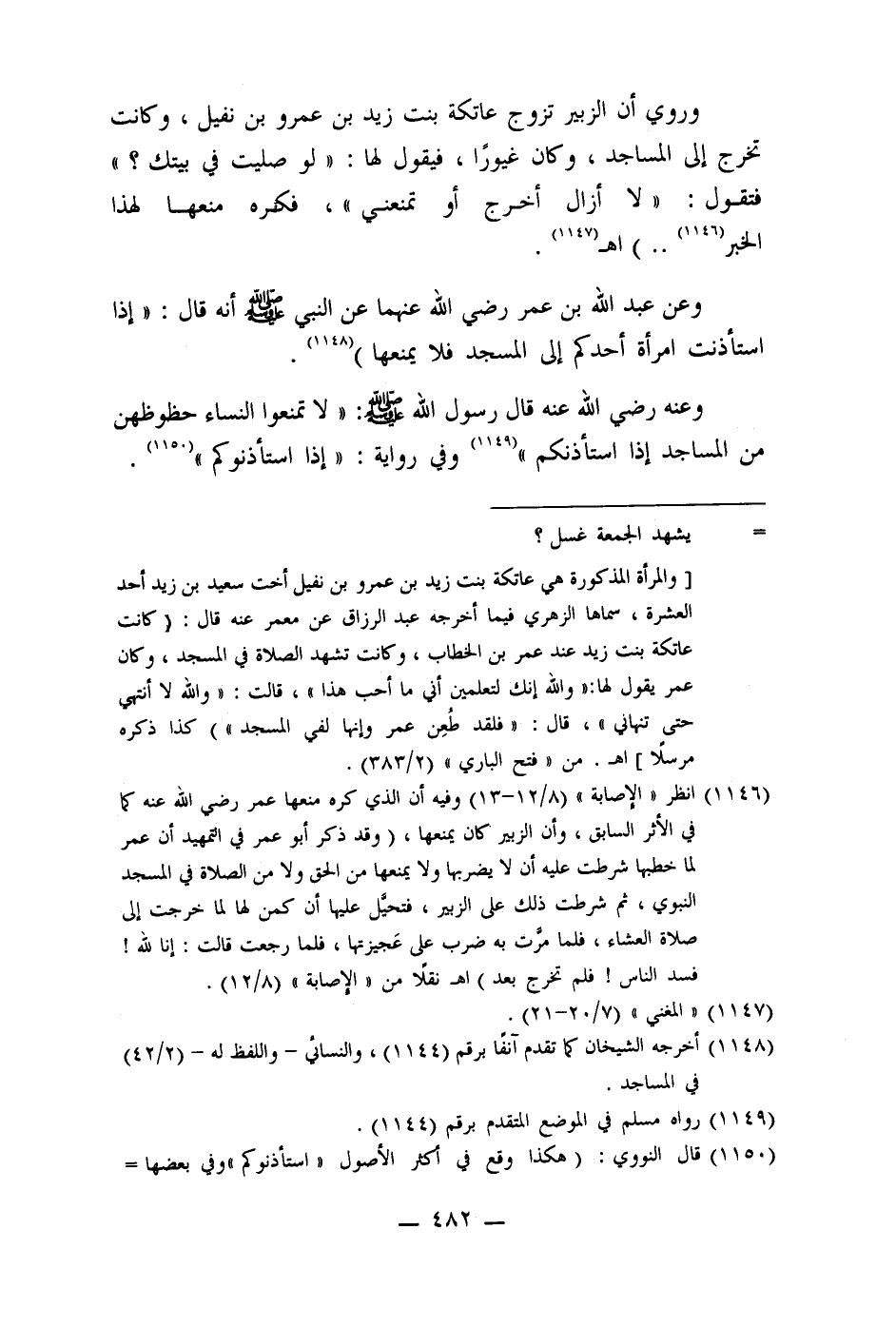 (1146) انظر " الإصابة " (8/12-13) وفيه أن الذي كره منعها عمر رضي الله عنه كما في الأثر السابق، وأن الزبير كان يمنعها، (وقد ذكر أبو عمر في التمهيد أن عمر لما خطبها شرطت عليه أن لا يضربها ولا يمنعها من الحق ولا من الصلاة في المسجد النبوي، ثم شرطت ذلك على الزبير، فتحيل عليها أن كمن لها لما خرجت إلى صلاة العشاء، فلما مرت به ضرب على عَجيزتها، فلما رجعت قالت: إنا لله! فسد الناس! فلم تخرج بعد) اهـ نقلًا من " الإصابة" (8/12) .