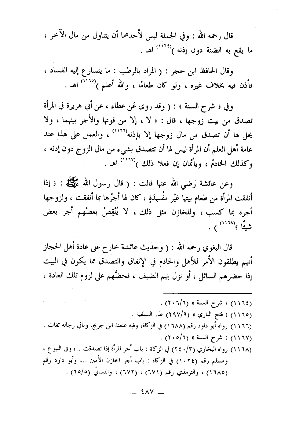 وفي " شرح السنة ": (وقد روى عَن عطاء، عن أبي هريرة في المرأة تصدق من بيت زوجها، قال: " لا، إلا من قوتها والأجر بينهما، ولا يحل لها أن تصدق من مال زوجها إلا بإذنه (1166) ، والعمل على هذا عند عامة أهل العلم أن المرأة ليس لها أن تتصدق بشيء من مال الزوج دون إِذنه، وكذلك الخادمُ، ويأثمان إن فعلا ذلك) (1167) اهـ.