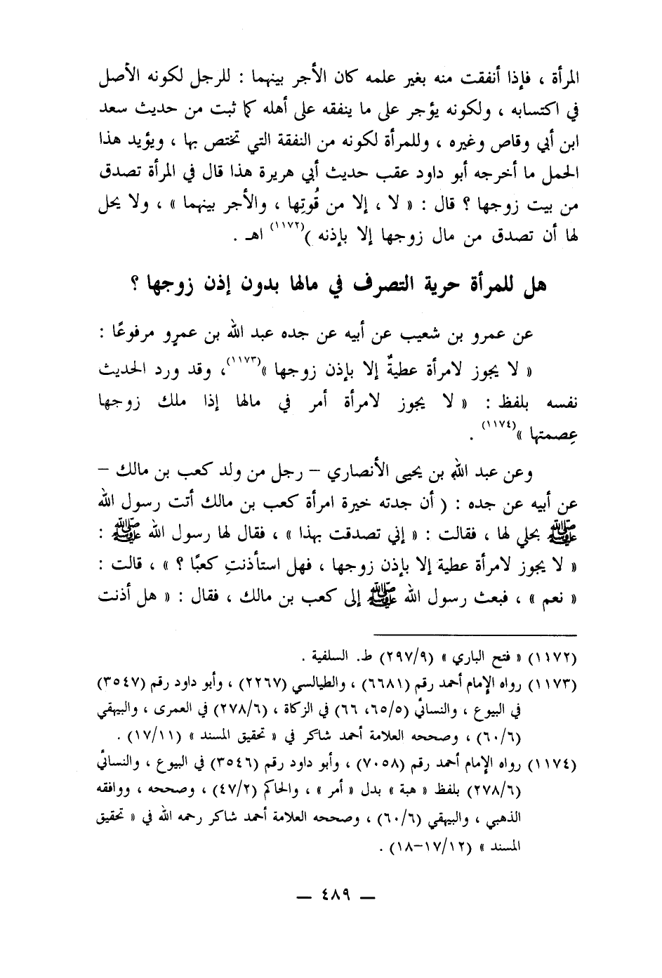 عن عمرو بن شعيب عن أبيه عن جده عبد الله بن عمرو مرفوعا: " لا يجوز لامرأة عطية إلا بإذن زوجها " (1173) ، وقد ورد الحديث نفسه بلفظ: " لا يجوز لامرأة أمر في مالها إذا ملك زوجها عِصمتها " (1174) .