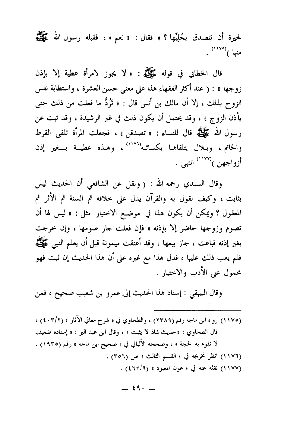وقال السندي رحمه الله: (ونقل عن الشافعي أن الحديث ليس بثابت، وكيف نقول به والقرآن يدل على خلافه ثم السنة ثم الأثر ثم المعقول؟ ويمكن أن يكون هذا في موضع الاختيار مثل: " ليس لها أن تصوم وزوجها حاضر إلا بإذنه " فإن فعلت جاز صومها، وإن خرجت بغير إذنه فباعت، جاز بيعها، وقد أعتقت ميمونة قبل أن يعلم النبي صلى الله عليه وسلم فلم يعب ذلك عليها، فدل هذا مع غيره على أن هذا الحديث إن ثبت فهو محمول على الأدب والاختيار.