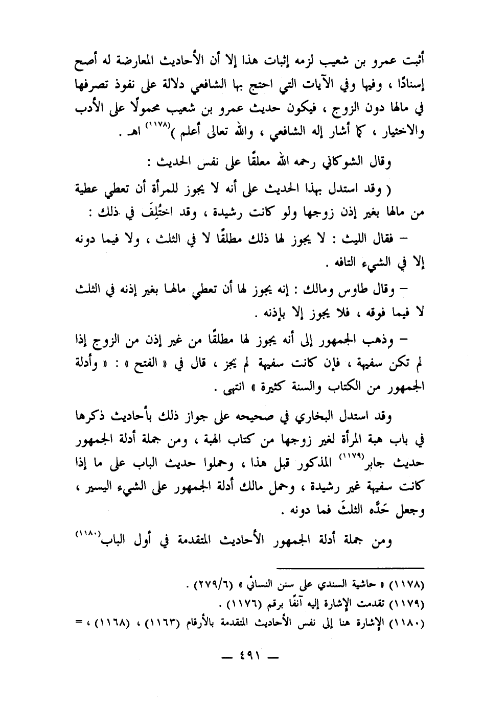 وقد استدل البخاري في صحيحه على جواز ذلك بأحاديث ذكرها في باب هبة المرأة لغير زوجها من كتاب الهبة، ومن جملة أدلة الجمهور حديث جابر (1179) المذكور قبل هذا، وحملوا حديث الباب على ما إذا كانت سفيهة غير رشيدة، وحمل مالك أدلة الجمهور على الشيء اليسير، وجعل حَده الثلثَ فما دونه.