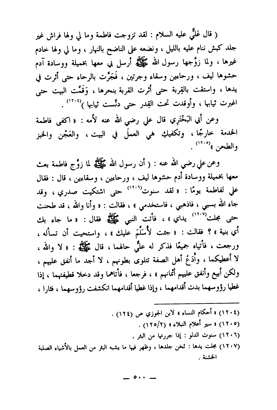 (قال عَلىُّ عليه السلام: لقد تزوجت فاطمة وما لي ولها فراش غير جلد كبش ننام عليه بالليل، ونضعه على الناضح بالنهار، وما لي ولها خادم غيرها، ولما زوجها رسول الله صلى الله عليه وسلم أرسل بي معها بخميلة ووسادة آدم حشوها ليف، ورحاءين وسقاء وجرتين، فَجَرت بالرحاء حتى أثرت في يدها، واستقت بالقِربة حتى أثرت القربة بنحرها، وَقَمَّت البيت حتى اغبرت ثيابها، وأوقدت تحت القِدر حتى دنست ثيابها (1204) .