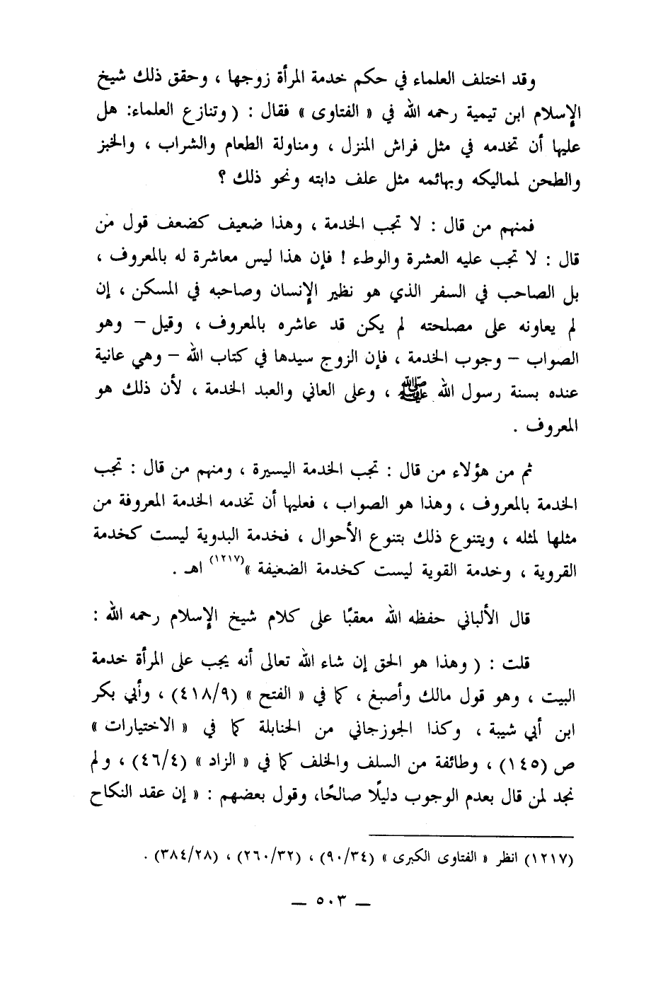 قال الألباني حفظه الله معقبًا على كلام شيخ الإسلام رحمه الله: قلت: (وهذا هو الحق إن شاء الله تعالى أنه يجب على المرأة خدمة البيت، وهو قول مالك وأصبغ، كما في " الفتح" (9/418) ، وأبي بكر ابن أبي شيبة، وكذا الجوزجاني من الحنابلة كما في " الاختيارات" ص (145) ، وطائفة من السلف والخلف كما في " الزاد" (4/46) ، ولم نجد لمن قال بعدم الوجوب دليلا صالحًا، وقول بعضهم: "إن عقد النكاح
