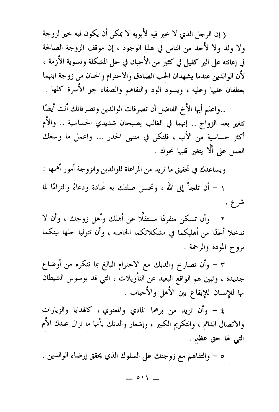 (إن الرجل الذي لا خير فيه لأبويه لا يمكن أن يكون فيه خير لزوجة ولا ولد ولا لأحد من الناس في هذا الوجود، إن موقف الزوجة الصالحة في إعانته على البر كفيل في كثير من الأحيان في حل المشكلة وتسوية الأزمة، لأن الوالدين عندما يشهدان الحب الصادق والاحترام والحنان من زوجة ابنهما يعطفان عليها وعليه، ويسود الود والتفاهم والصفاء جو الأسرة كلها.