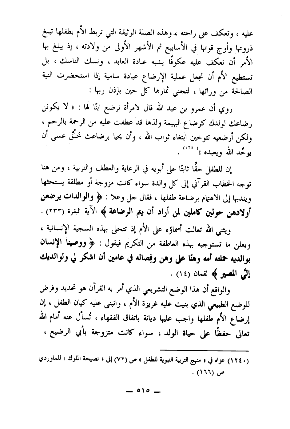 إن للطفل حقا ثابتًا على أبويه في الرعاية والعطف والتربية، ومن هنا توجه الخطاب القرآني إلى كل والدة سواء كانت مزوجة أو مطلقة يستحثها ويندبها إلى الاهتمام برضاعة طفلها، فقال جل وعلا: (والوالدات يرضعن أولادهن حولين كاملين لمن أراد أن يتم الرضاعة) الآية البقرة (233) .