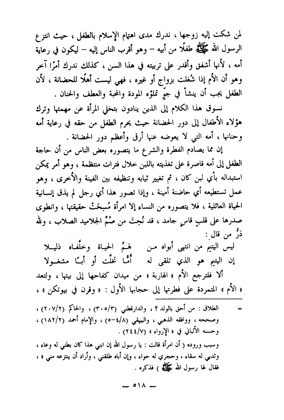 إن مما يصادم الفطرة والشرع ما يتصوره بعض الناس من أن حاجة الطفل إلى أمه قاصرة على تغذيته باللبن خلال فترات منتظمة، وهو أمر يمكن استبداله بأي لبن كان، ثم تغيير ثيابه وتنظيفه بين الفينة والأخرى، وهو عمل تستطيعه أي حاضنة أمينة، وإذا تصور هذا أي رجل لم يذق إنسانية الحياة العائلية، فلا يتصوره من النساء إلا امرأة مُسِختْ حقيقتها، وانطوى صدرها على قلب قاس جامد، قد نُحِتَ من صُم الجلاميد الصلاب، ولله دَر من قال: