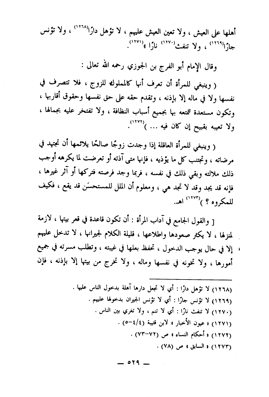 [والقول الجامع في آداب المرأة: أن تكون قاعدة في قعر بيتها، لازمة لمنزلها، لا يكثر صعودها واطلاعها، قليلة الكلام لجيرانها، لا تدخل عليهم إلا في حال يوجب الدخول، تحفظ بعلها في غيبته، وتطلب مسرته في جميع أمورها، ولا تخونه في نفسها وماله، ولا تخرج من بيتها إلا بإذنه، فإن